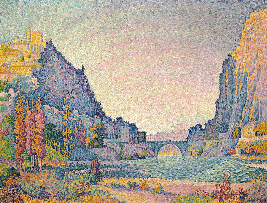 Sisteron depicts a town known as the ‘Gateway to Provence’, situated in a narrow gap between two mountain ranges. The scene is rendered in marvellous, shimmering Neo-Impressionistic brushwork.