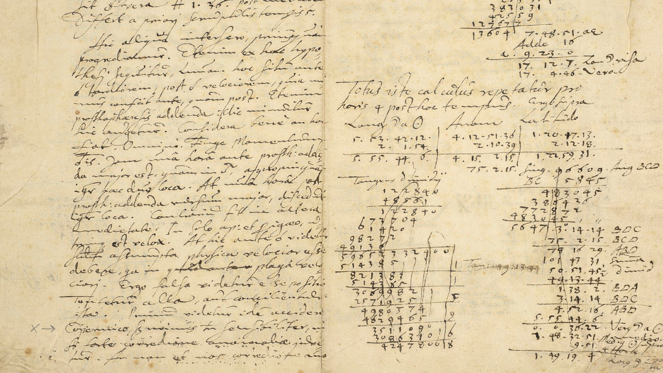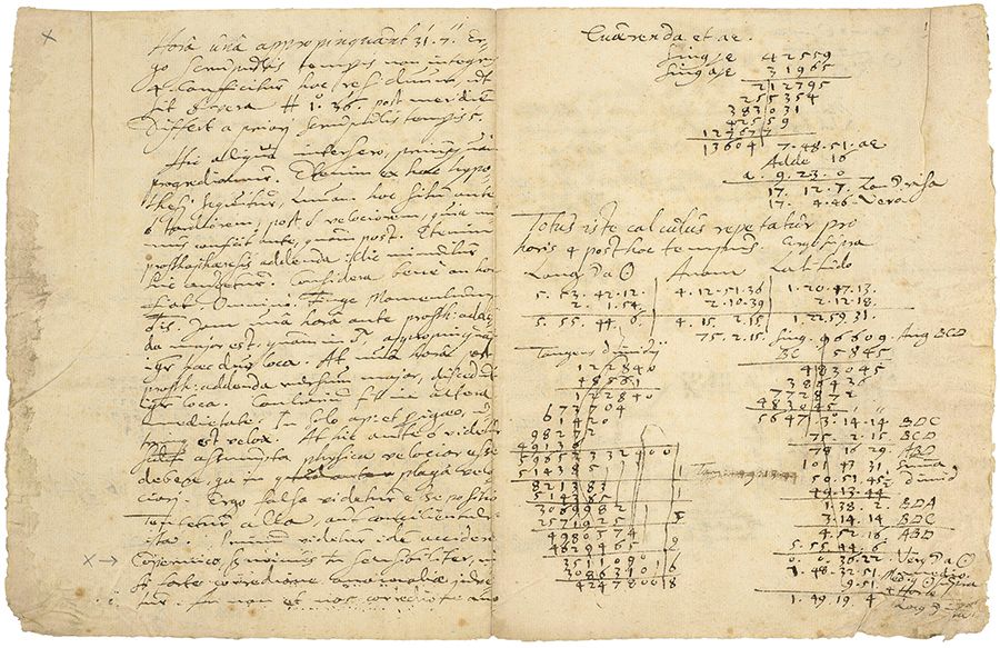 Likely written during his early years in Prague after Brahe's death, these four pages are Kepler's examination of the variation of a planet's rate of motion at different stages of its orbit, a line of thought that led to his renowned Laws of Planetary Motion. The calculations relate to the longitude of the moon and the sun, and the movement of the moon within its orbit.