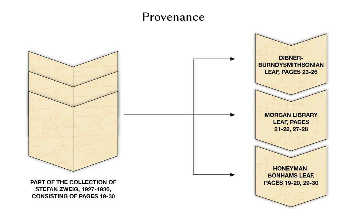 In 1936, these four pages appeared in Hinterberger's Katalog IX of Zweig's collection, consigned from his exile in London. Considered the best leaf – particularly for its mention of Copernicus – they are the only pages of this important scientific manuscript remaining in private hands. From the original 12 pages in Zweig's collection, four are now at the Morgan Library and four are in the Smithsonian collection.