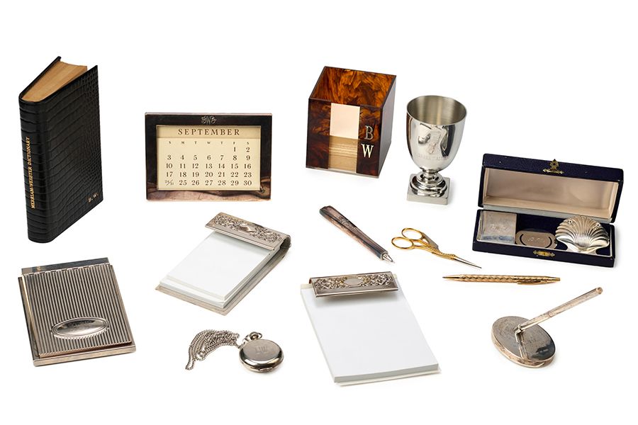 These include a monogramed calendar frame; a monogrammed sterling silver pen, awarded to her as a Humanitarian Award in 1980; a pair of silver-plated notepad covers, one which was given to Walters on the 15th anniversary with ABC News; a dictionary; and a compact. The items are both cultural icons and the simple desk articles of a working woman, whose every facet of her life was infused with elegance.