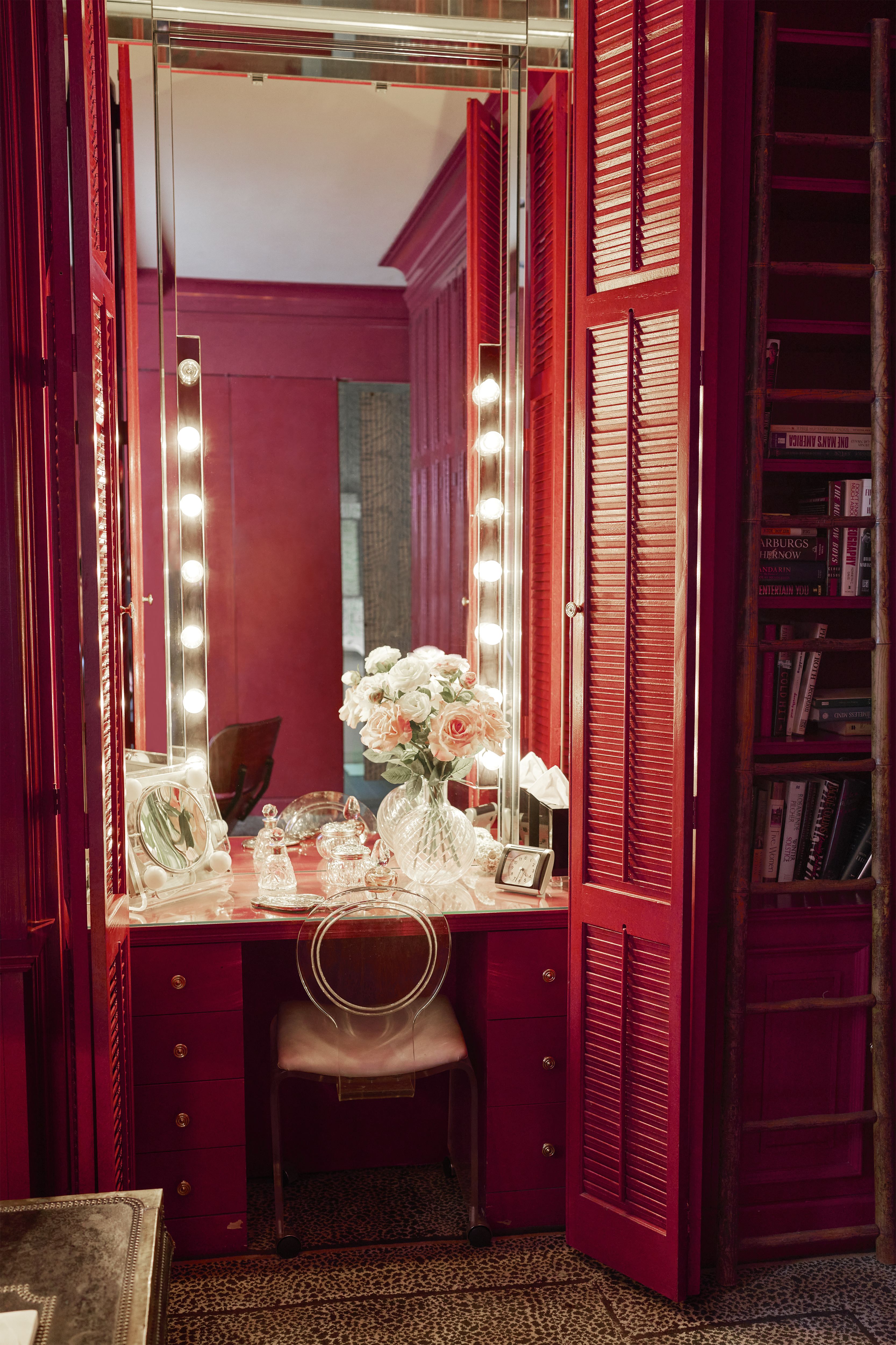 This chair and small mirror are where she sat to do her hair and makeup. While there is no record of where these items were acquired, they were most likely purchased early in her career, and stayed in her home through the years. The clear acrylic renders them as “invisible” items that can be added seamlessly to any room, just as they sat in Walters's stunning, red-walled sitting room.