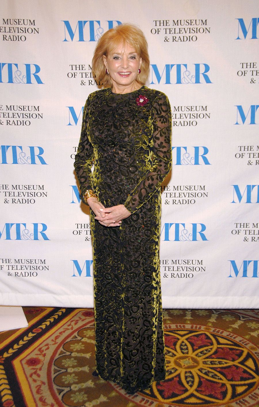 This green velvet gown was designed by de la Renta and worn by Walters to the 2007 Museum of Television & Radio's Annual Gala at the Waldorf Hotel in New York. She paired the stunning dress with her signature magenta-pink pops of color, with a floral ruby and diamond brooch and earrings.