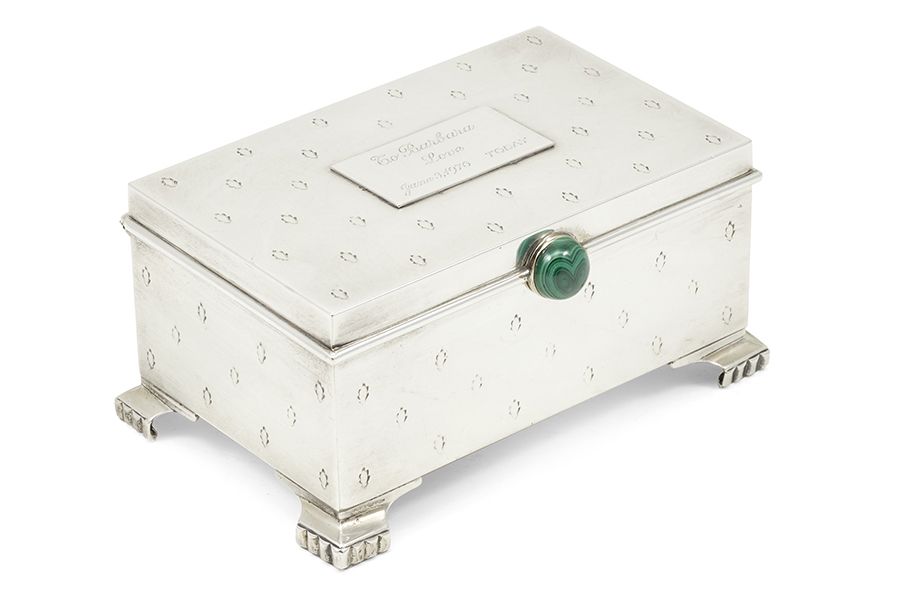 An American 14k Gold And Malachite Mounted Sterling Silver Jewelry Box. Estimate: US$400 - US$600