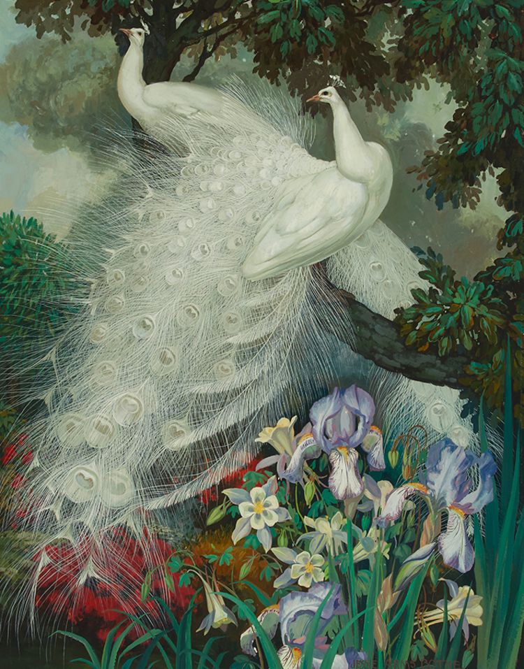 White Peacocks and Iris is one of my favorites for its visually arresting qualities. Here, Botke truly demonstrates her mastered abilities to paint the delicate and intricate plumages of peacocks and her interest in creating unique wonder filled worlds inspired by her interest in Japanese screens. The white peacocks rest in splendid beauty among vibrantly painted flowers and fauna, giving them an imperial quality that I admire. Aside from its splendid beauty, this work is a superb example in the artist's body of work.