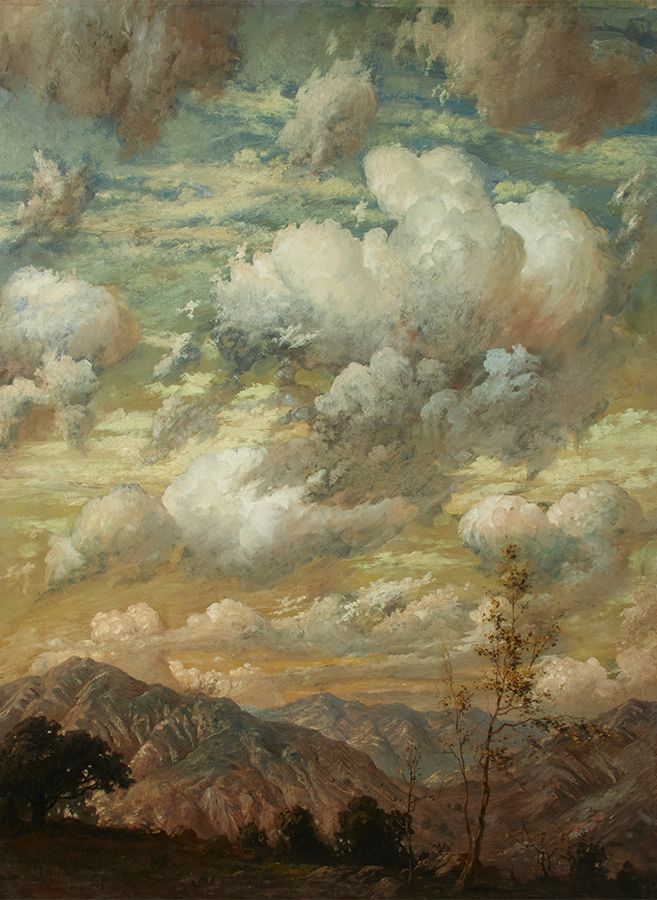 The word virtuosity comes to mind when I look at Paul Grimm’s Clouds Gathering Above Pasadena. It is such an impressive display of skill and the spectacle of nature. The cloud confections that dominate the scene are elegantly painted with a sense of lightness that reminds me of a Rococo painting’s exuberant curving forms.