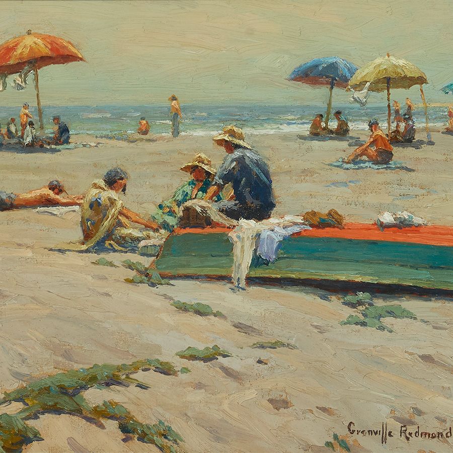 This is one of the nicest Granville Redmond paintings that I have seen. Not only because it is a departure from his landscape work, but also because Redmond captures the bathers in such an elegant balance of color and light. The woman in the center has a beautiful shawl, or towel around her shoulders. The umbrellas balance the scene while the boat give the composition’s center weight. All in all, as perfect a California plein air scene as we have been fortunate enough to offer.