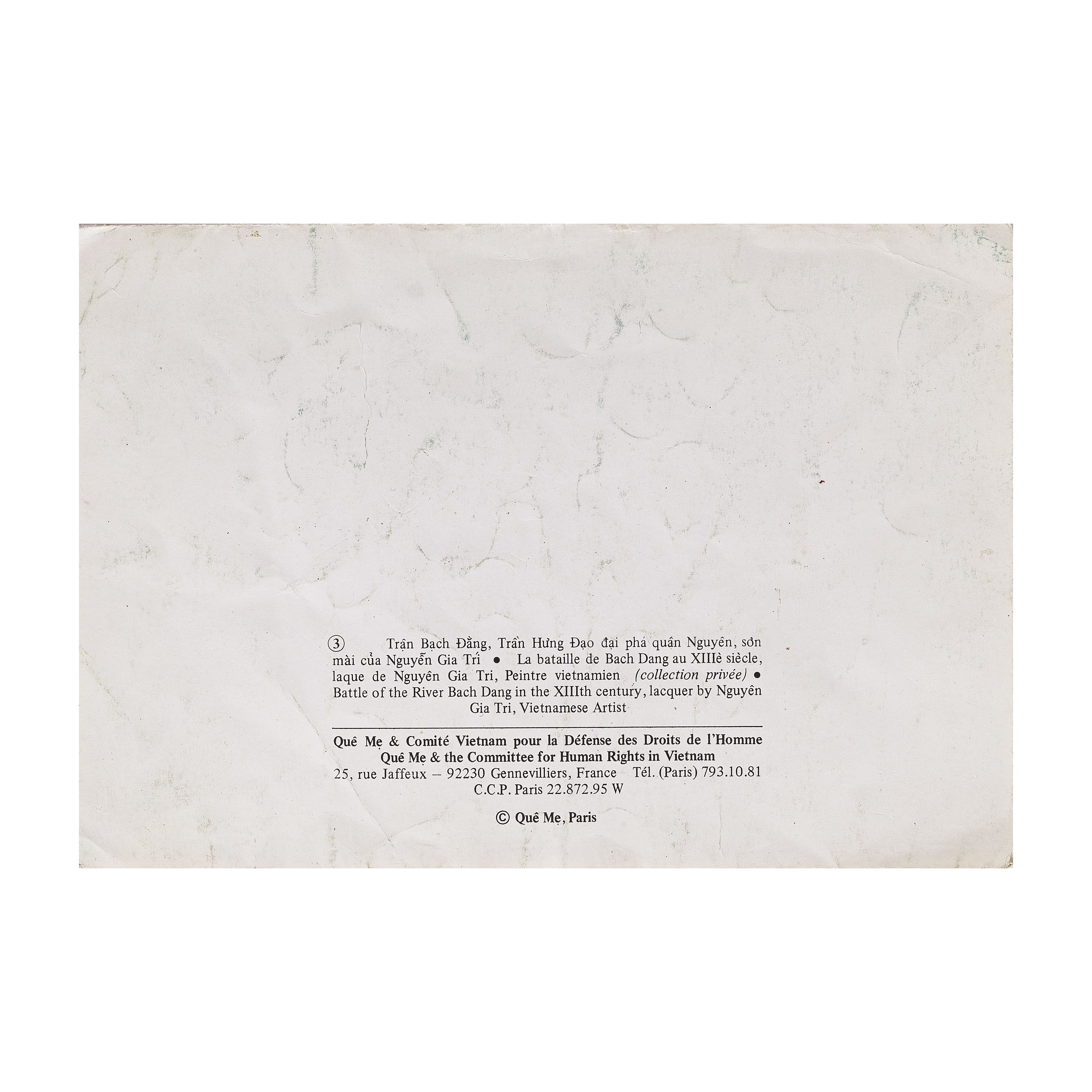 After the fall of Saigon in 1975, the panel was sold to a European private collector and later acquired by the present owner in the 2000s. It is accompanied by a printed card from 'Quê Me & the Committee for Human Rights in Vietnam', France, where the painting is reproduced. The caption notes the title Battle of the River Bạch Đằng in the XIIIth century, lacquer by Nguyễn Gia Trí, Vietnamese Artist. It is likely that this panel was recognised at that time as a work by Nguyễn Gia Trí.
