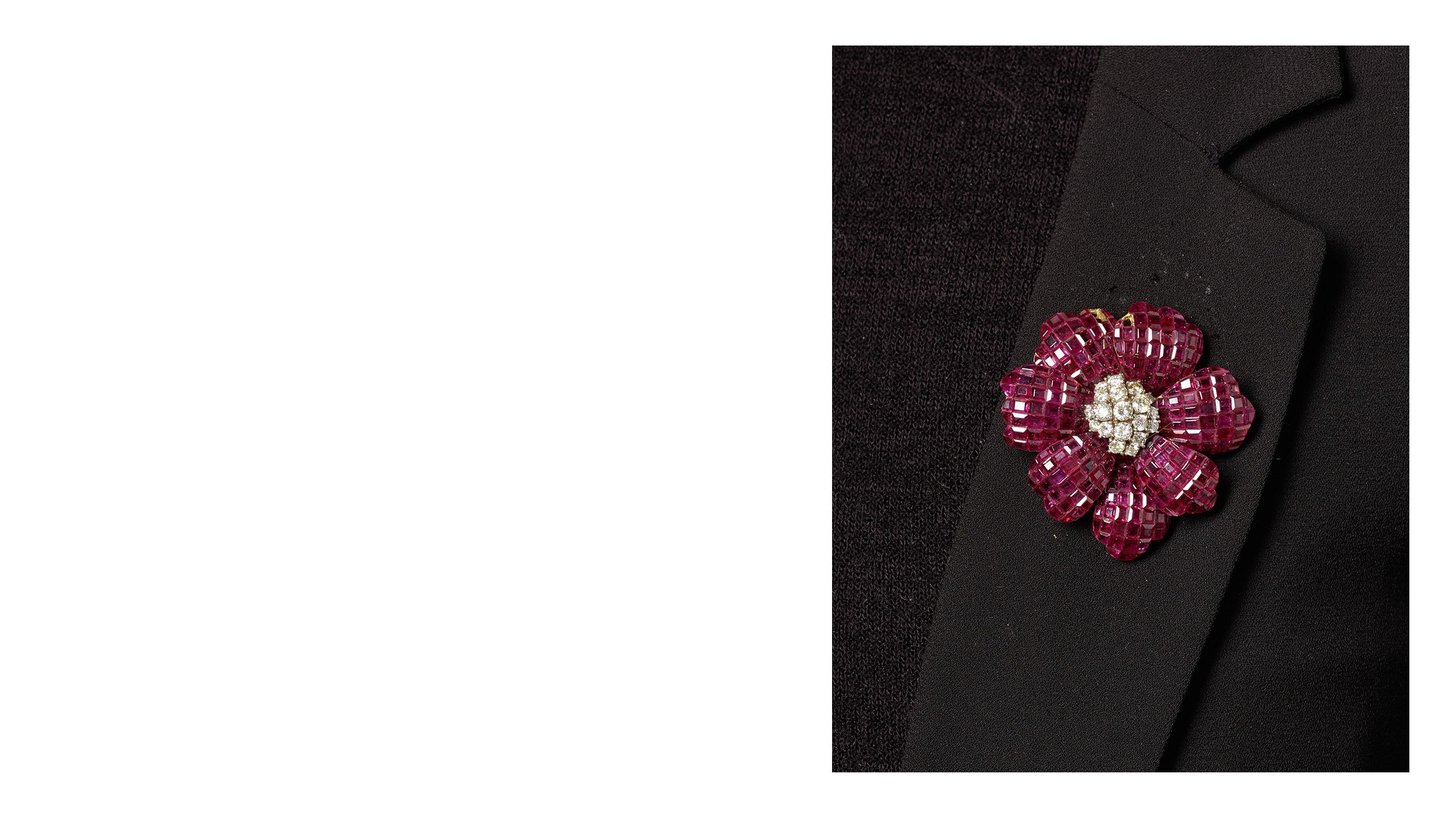 Barbara is best remembered wearing this distinctive brooch, with invisible set square-cut rubies and round brilliant-cut diamonds, at the eighth Night of Stars fashion festival in New York in 1991, where she was photographed alongside actress Audrey Hepburn.