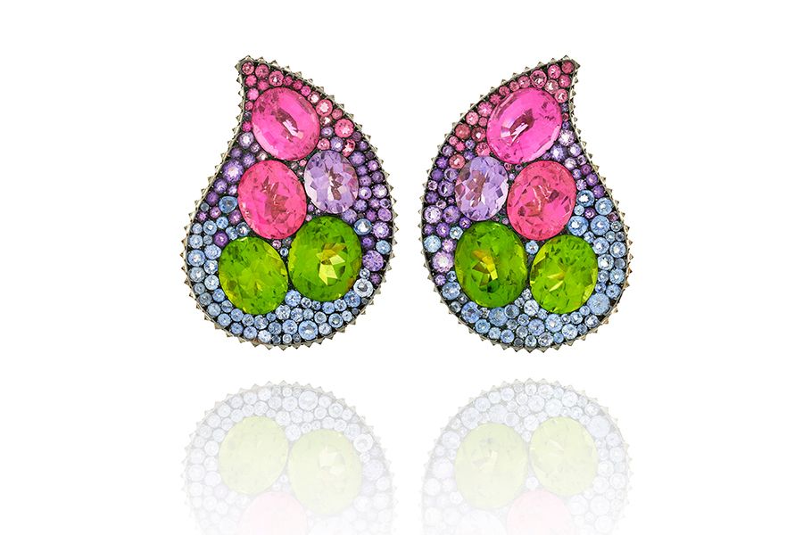 The earrings that JAR designed for Barbara are a riot of colors from their vibrant gemstones – including diamonds, peridots, garnets, tourmalines and sapphires – intensely rich and sometimes in deliberately clashing combinations. The paisley design earrings were one of her personal favorites.
