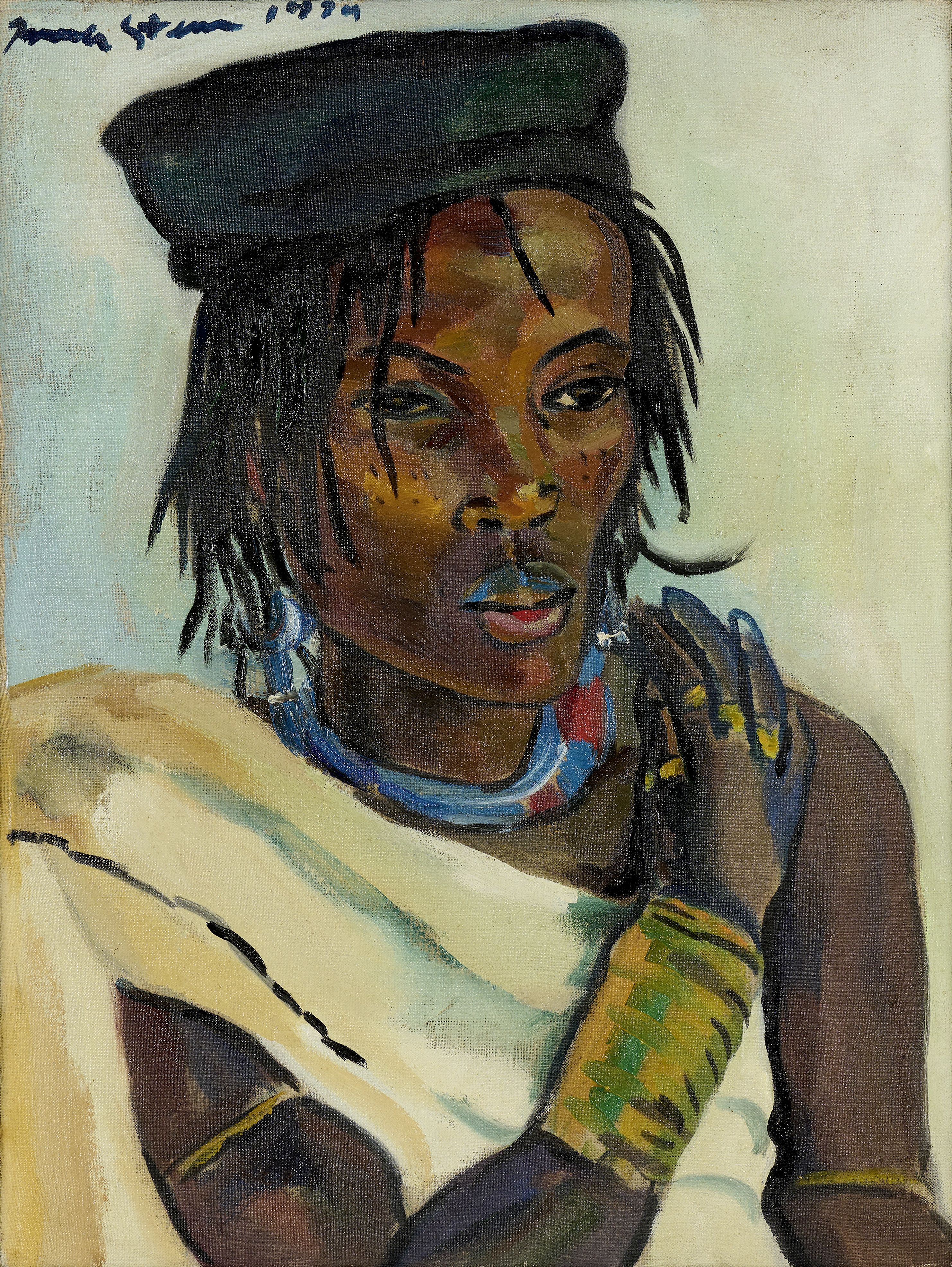 In the late 1930s and early 1940s, as the Second World War raged in Europe, Stern travelled extensively throughout central Africa. Of notable importance are her trips to Senegal in 1938, Zanzibar in 1939 and 1945, and Congo in 1942 and 1946, which fuelled her imagination and sparked a fertile creative period widely considered as the peak of her career. From this period are some of her most celebrated works, featuring vivid, acutely observed portraits of local indigenous people, such as Arab Priest, Arab with Dagger and Bahora Girl, all of them painted in 1945.
