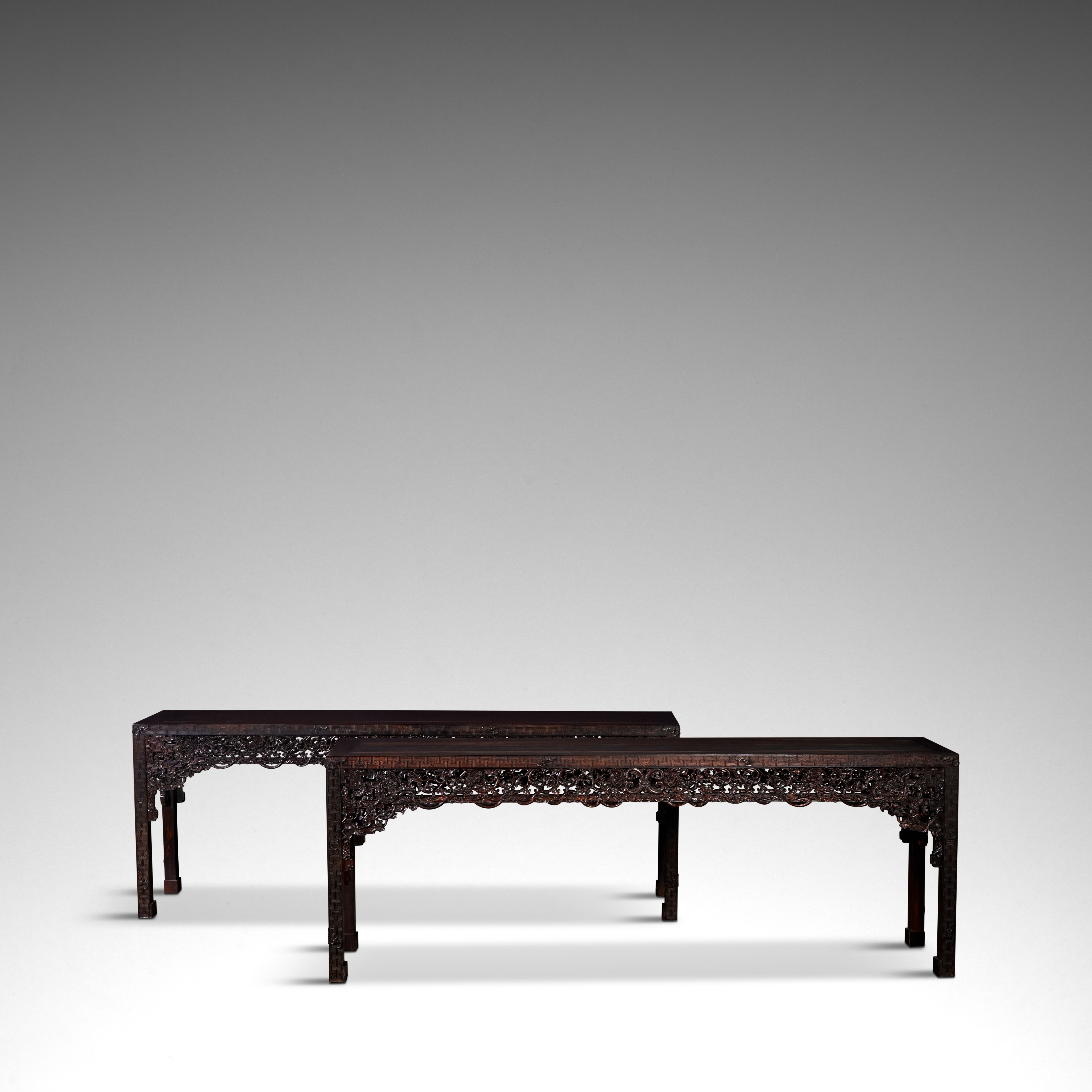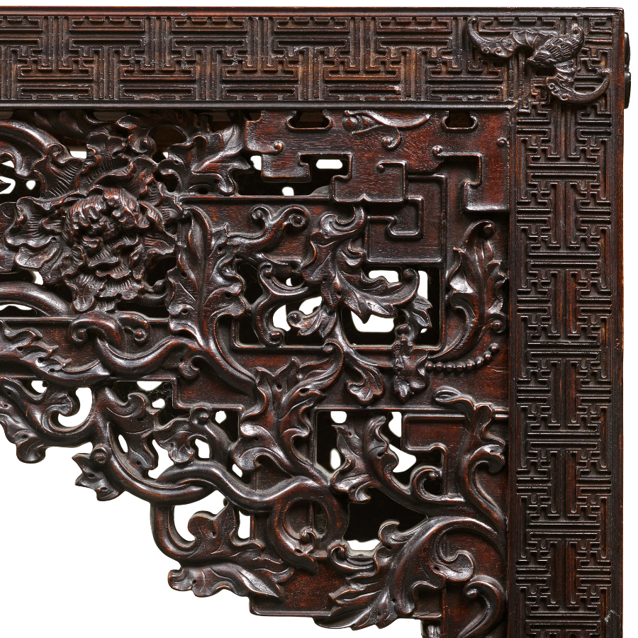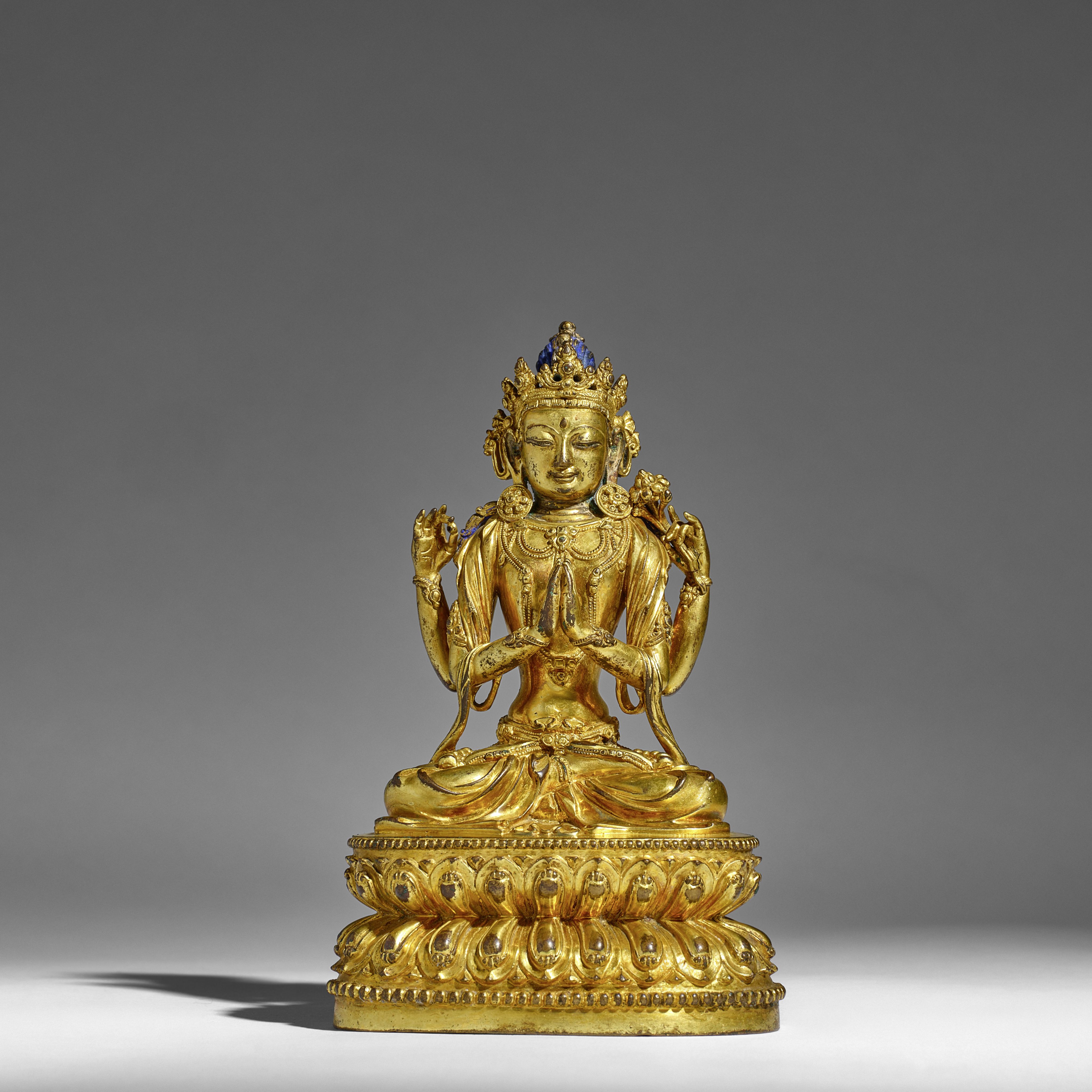 A rare gilt-bronze figure of Avalokiteshvara reflects the spiritual depth and technical mastery of the early Ming dynasty, while a pair of finely carved Zitan corner-leg tables from the Qianlong/Jiaqing period represents the height of court refinement. Further highlights include an exceptional Yangcai 'Lotus' bottle vase and an imposing 7th-century marble figure of Maitreya.