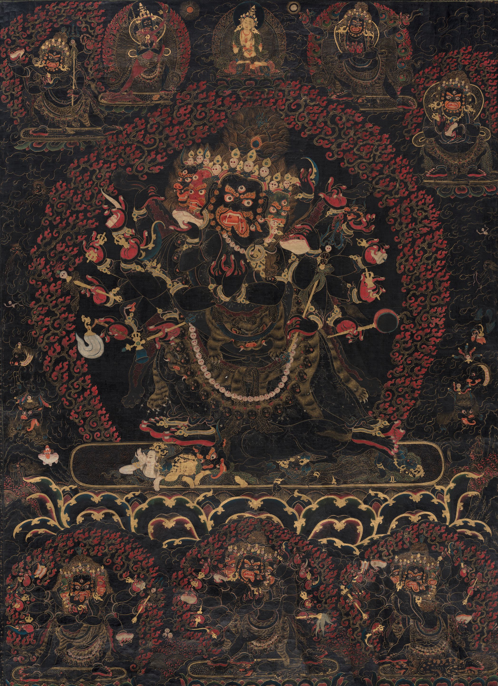 Discover two extraordinary Tibetan thangkas, each created in the 16th century, yet shaped by two distinct painting schools. A powerful Khyenri black-ground thangka presents Mahakala in monumental form. His sixteen arms and four faces emerge from a field of deep black with striking compositional clarity. In luminous contrast, a Menri painting attributed to Trengkawa shows Amitabha Buddha seated in meditation in his Pureland on a radiant gold ground, flanked by Avalokiteshvara and Vajrapani.