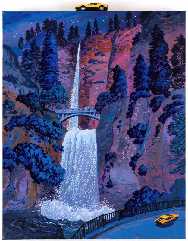 A Road Trip in Google Earth: Multnomah Falls, USA, 2021. Acrylic on canvas 40 x 50cm (16 x 20in)