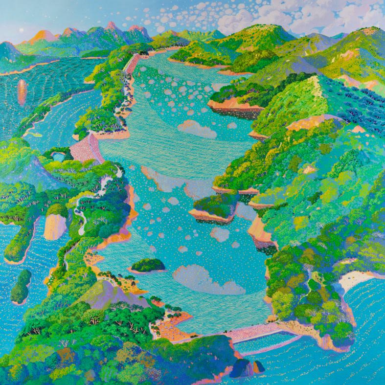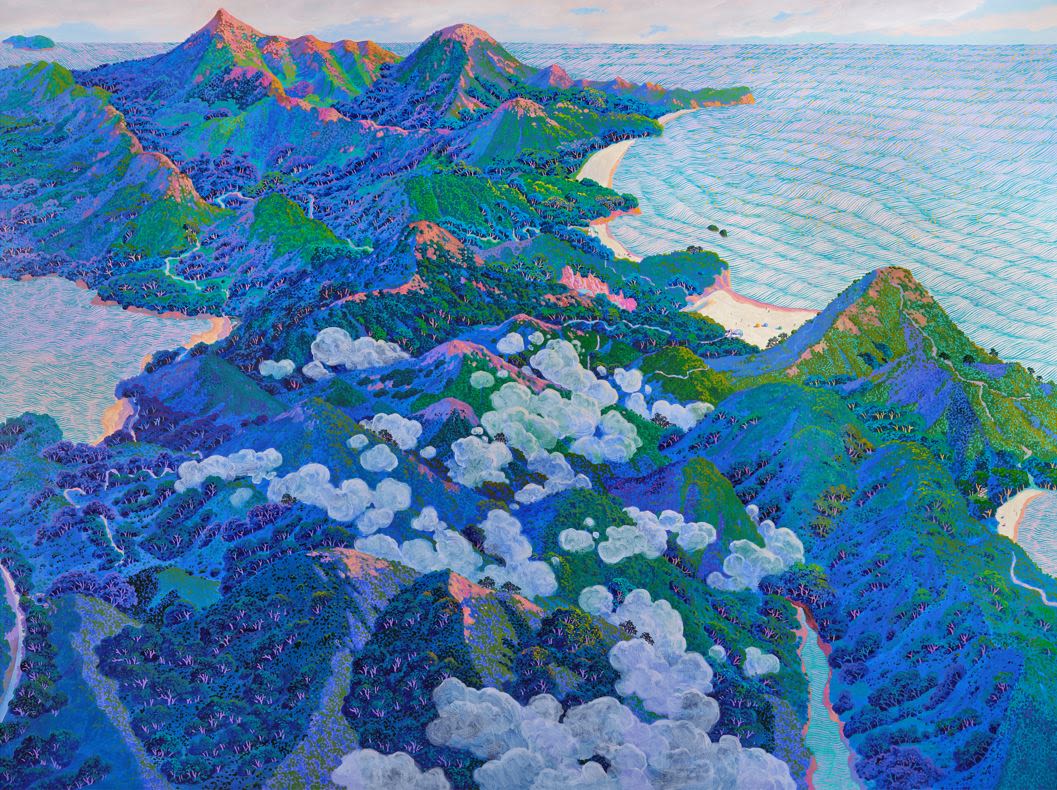 The Light House at Cape D’Aguilar (2019) expresses this sensibility in a single canvas, depicting the promontory stretching into the distance from an aerial perspective, with a neighbouring islet and headland on either side directing the eye towards the focal tower. The landforms appear closer here than in real life, subtly compressed by the artist.
