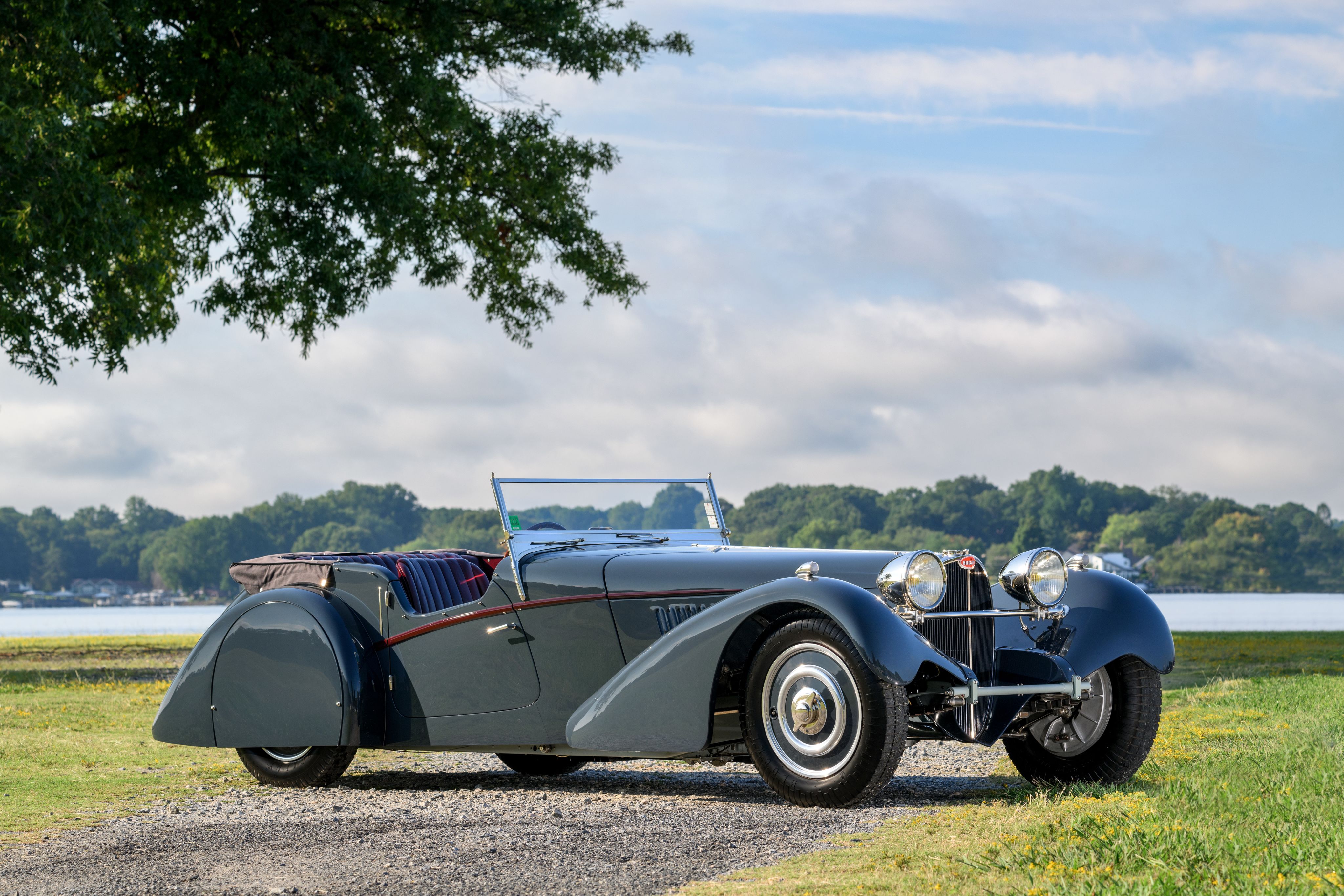 The Bugatti is restored to the highest condition, complete with racing red leather seats