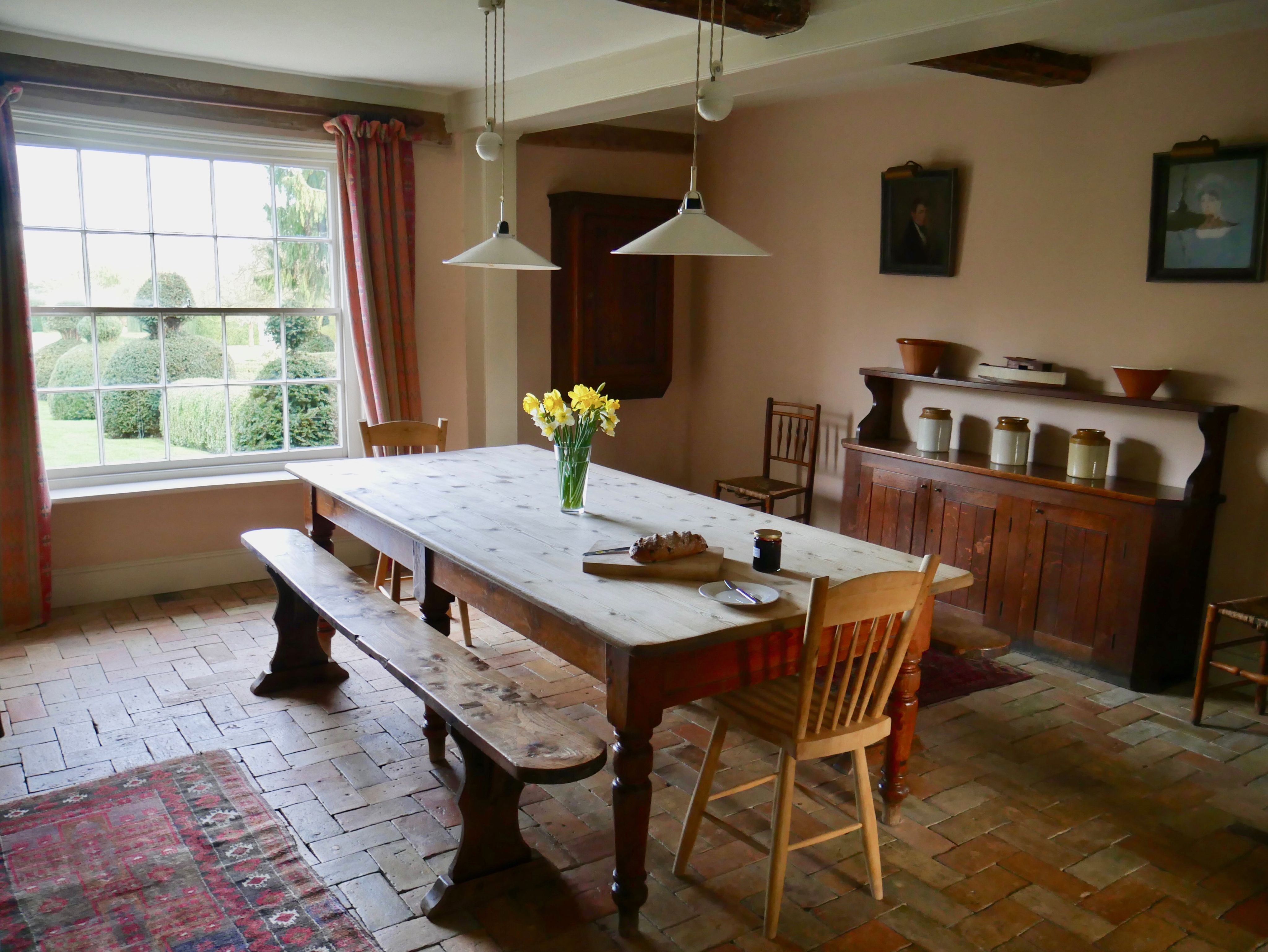 It’s that window on to that garden that makes the room, though. A large, crooked sash affair, built into a plaster oblong front installed in the 18th century, it ushers in the Constable skies and the prospect of a swelling Suffolk field-scape, dotted with oaks, that sweeps down to flat Holbrook Bay, and another similar set of farm buildings on a promontory in the far distance.