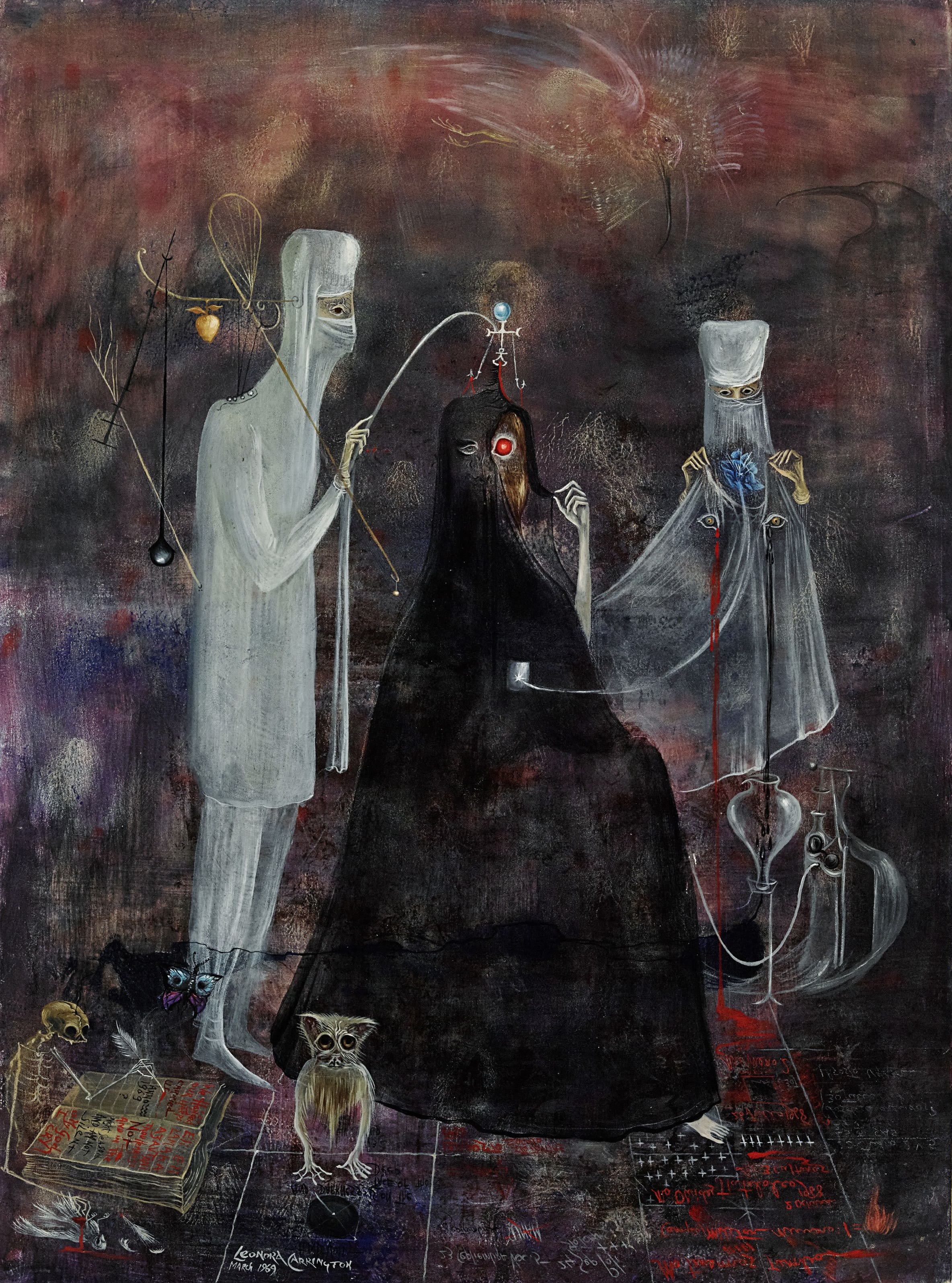 There is an air of deep disquiet about Leonora Carrington’s 1969 painting Operation Wednesday, which is offered in The Mind’s Eye sale at Bonhams in March. Two ghostly veiled figures, dressed in white and so thinly painted as to appear transparent, flank a third, draped in black and also see-through – the medium is tempera on board – with a lurid crimson socket, reminiscent of a small pomegranate, where one eye might have been. Above them, a vulture hovers, while a second avian harbinger of death looks on. A skeleton writes with a quill dipped in the blood of a dead pigeon. There’s a butterfly too, with eyes in its wings. And a chimerical, doleful creature seems to have emerged from the central figure’s skirt. The floor is a grid on which symbols, formulae and mirror-written words are inscribed. It’s a sinister scene. Are they alchemists? Or torturers?
