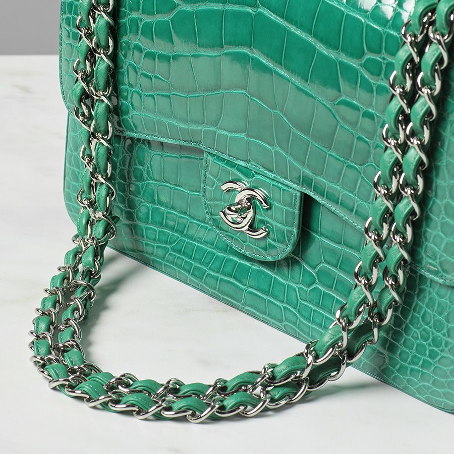 Chanel. A Shiny Emerald Green Alligator Jumbo Double Flap Bag, 2014. Vendu 12,750 £ commission incluse