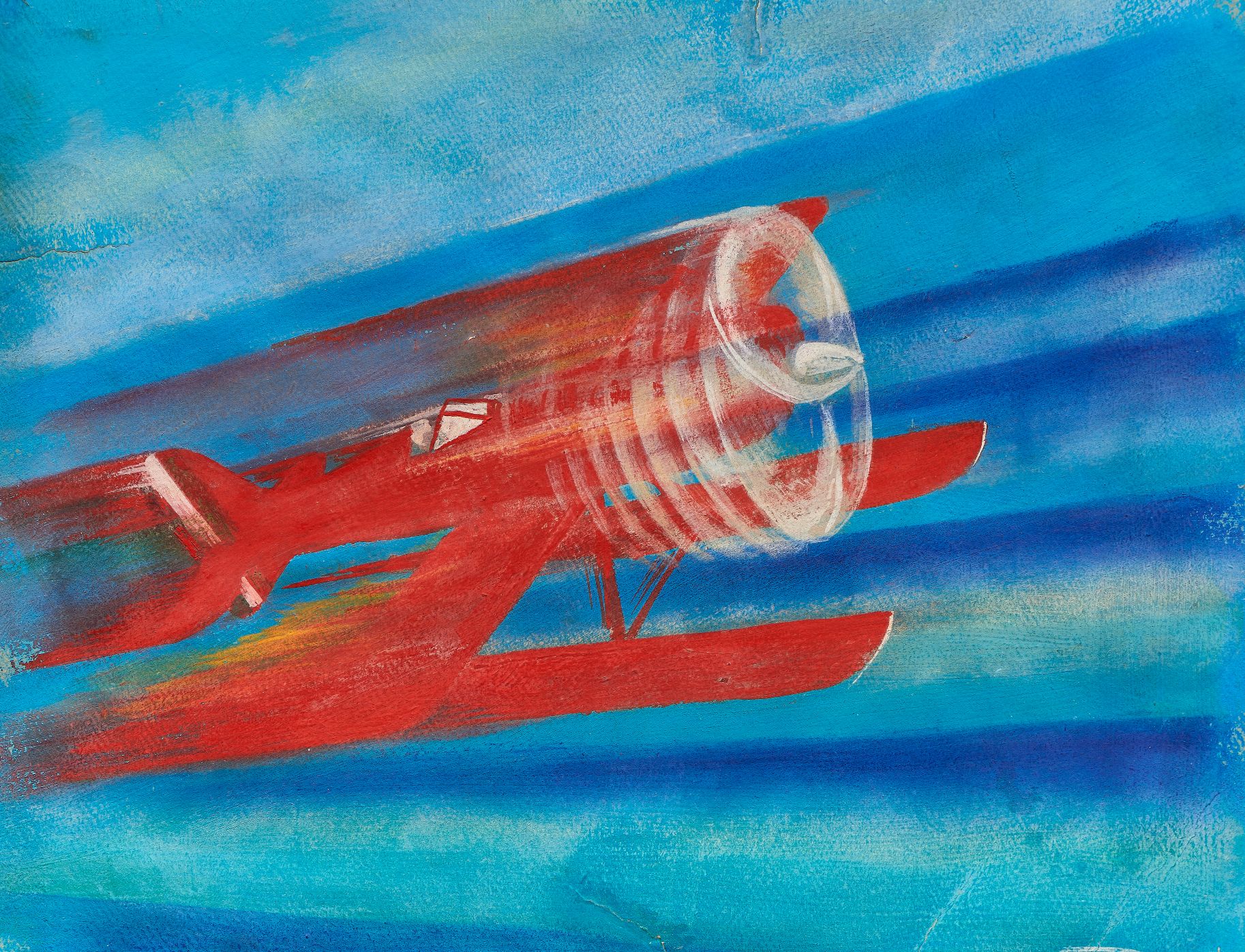 When it came to colour and gestural movement, there were no half measures. They were deployed liberally to embody the multisensory and vivid experience of flight. As the Aeropittura manifesto professed, ‘Every aeropainting simultaneously contains the dual movement of the plane and the hand of the painter as he moves his pencil, brush or diffuser…’