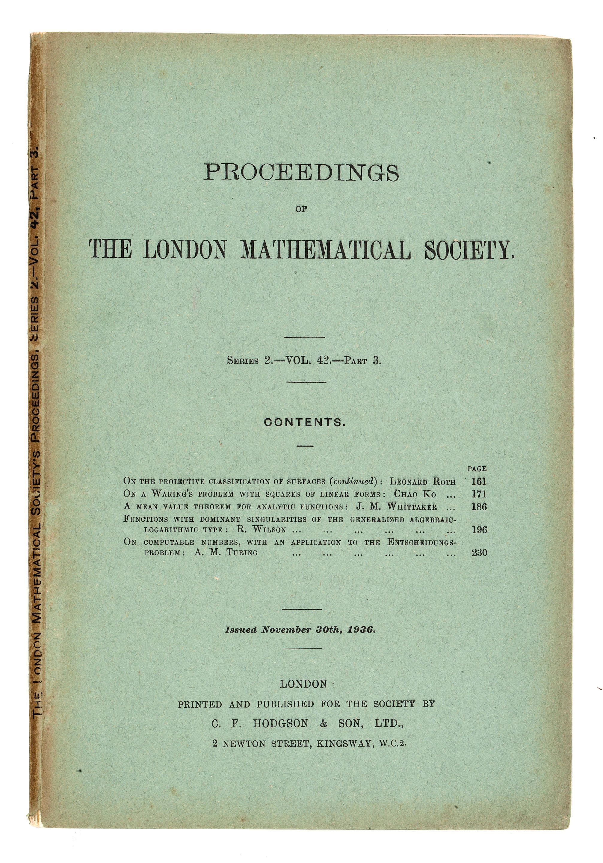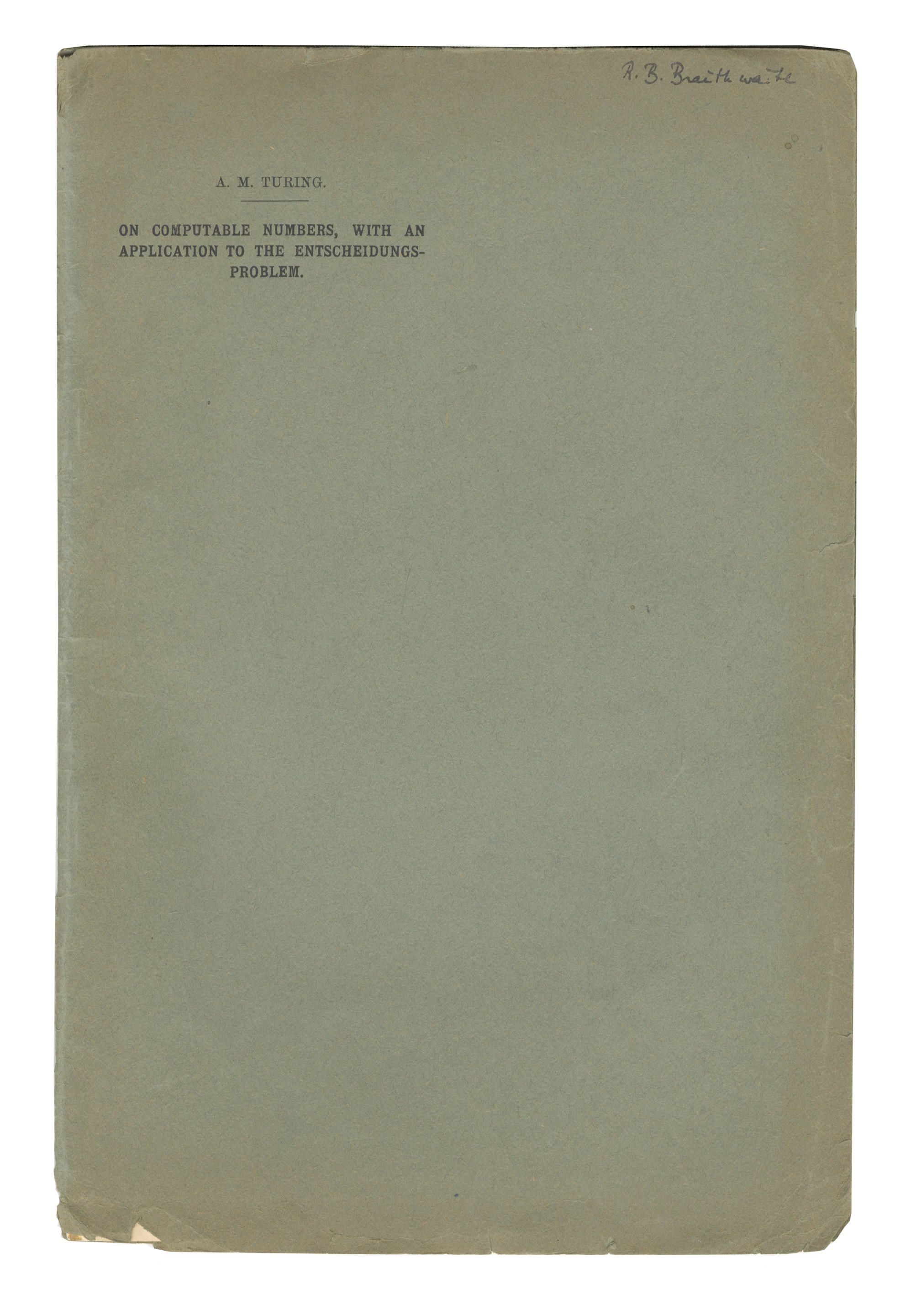 Turing, Alan Mathison. 1912- 954, "On Computable Numbers, with an Application to the Entscheidungsproblem.". Sold for £50,000 inc. premium.