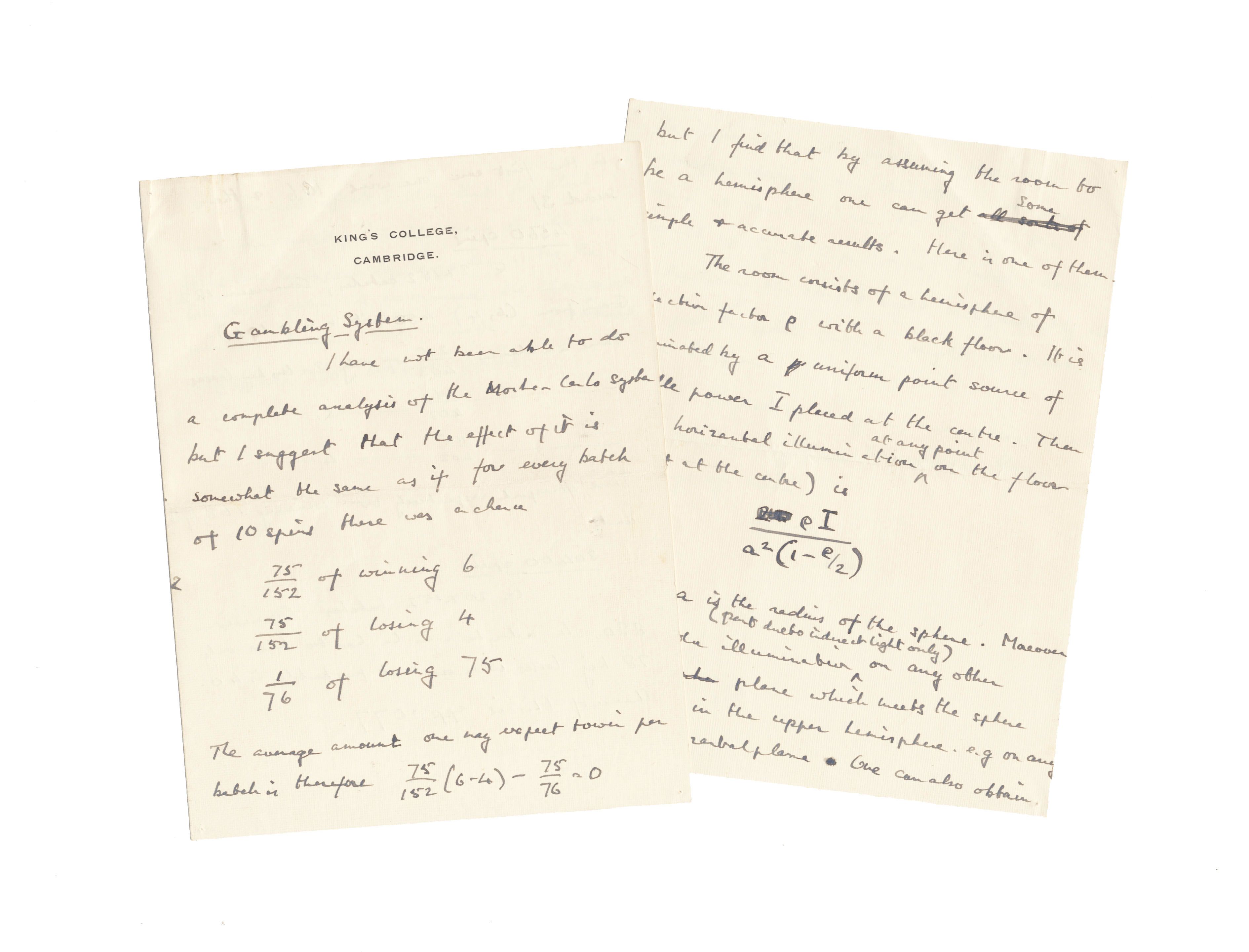 Turing (Alan), Autograph letter signed ("Yours Alan") to Alfred William Beuttell, sending a four-page analysis of the Monte-Carlo betting system and offering a solution to a technical lighting problem, Cambridge, 2 February [19]33. Sold for £94,000 inc. premium.