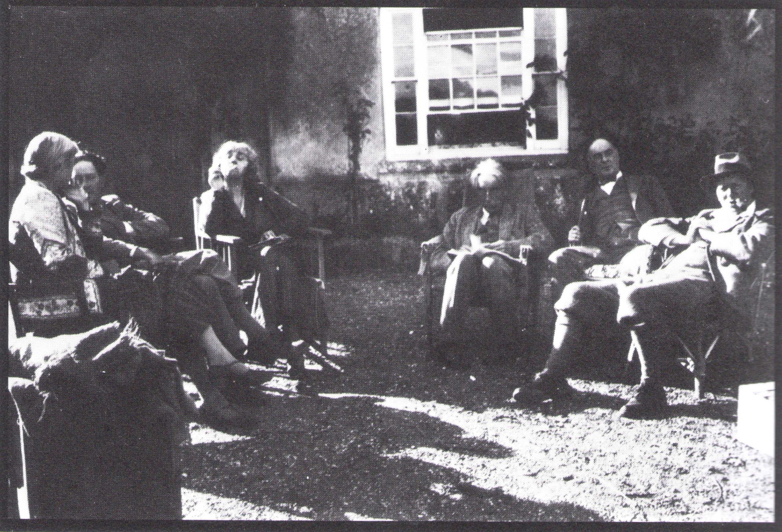 Black and white negative of a seated group on the terrace in front of the house at Charleston, Firle, Sussex, 1933 © Tate | From left to right: Vanessa Bell, Duncan Grant, Molly McCarthy, Roger Fry, Desmond MacCarthy and Clive Bell