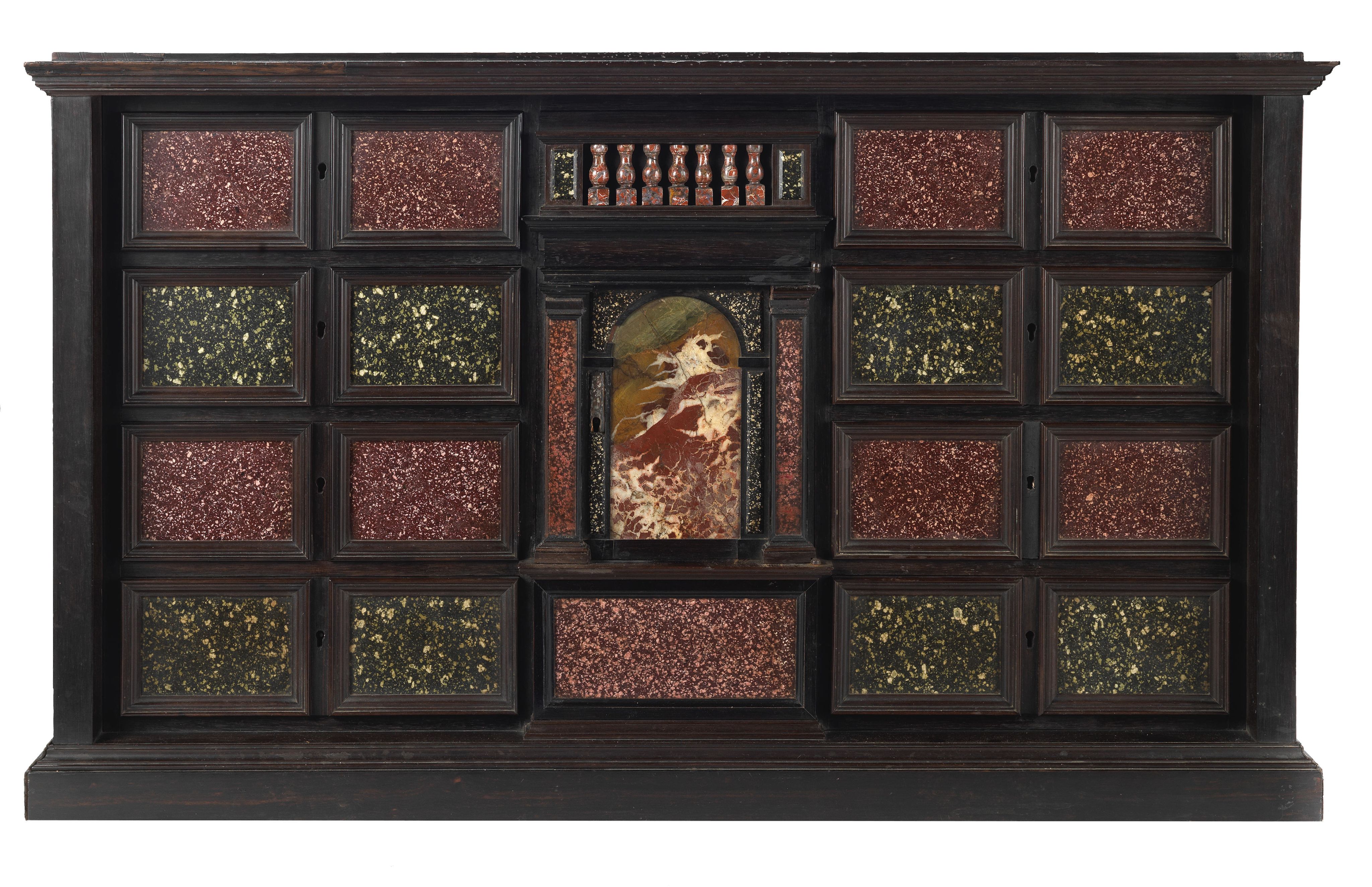 Lot 638. An Italian 19th century porphyry, porfido verde antico and marble inset ebony and ebonised cabinet incorporating a total of forty-four stone tablets of various proportions. Estimate: £6,000 - £9,000
