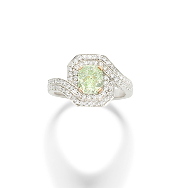 The green hues often found in natural diamonds are the result of the presence of radiation in the ground during the formation of the gem, perhaps through proximity to a mineral rich in uranium which would penetrate to the core of the stone.