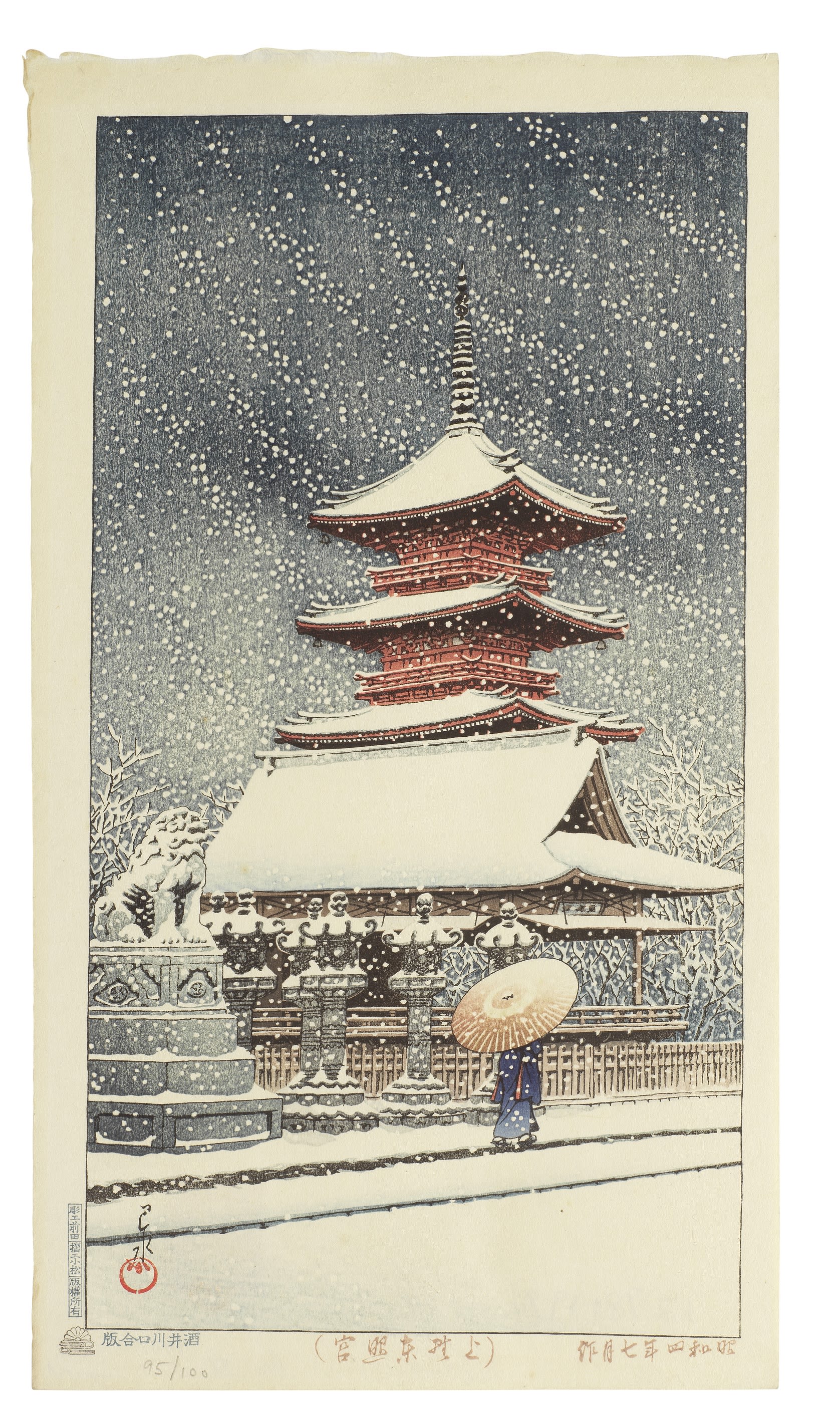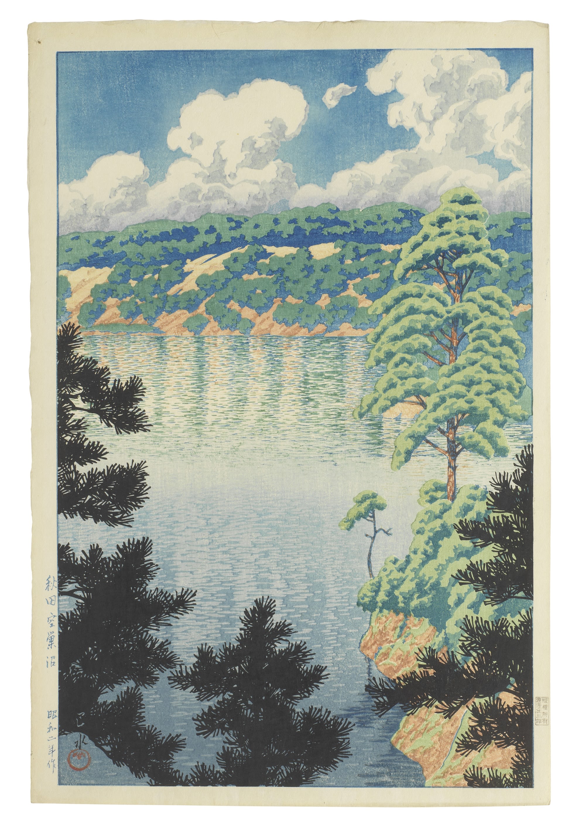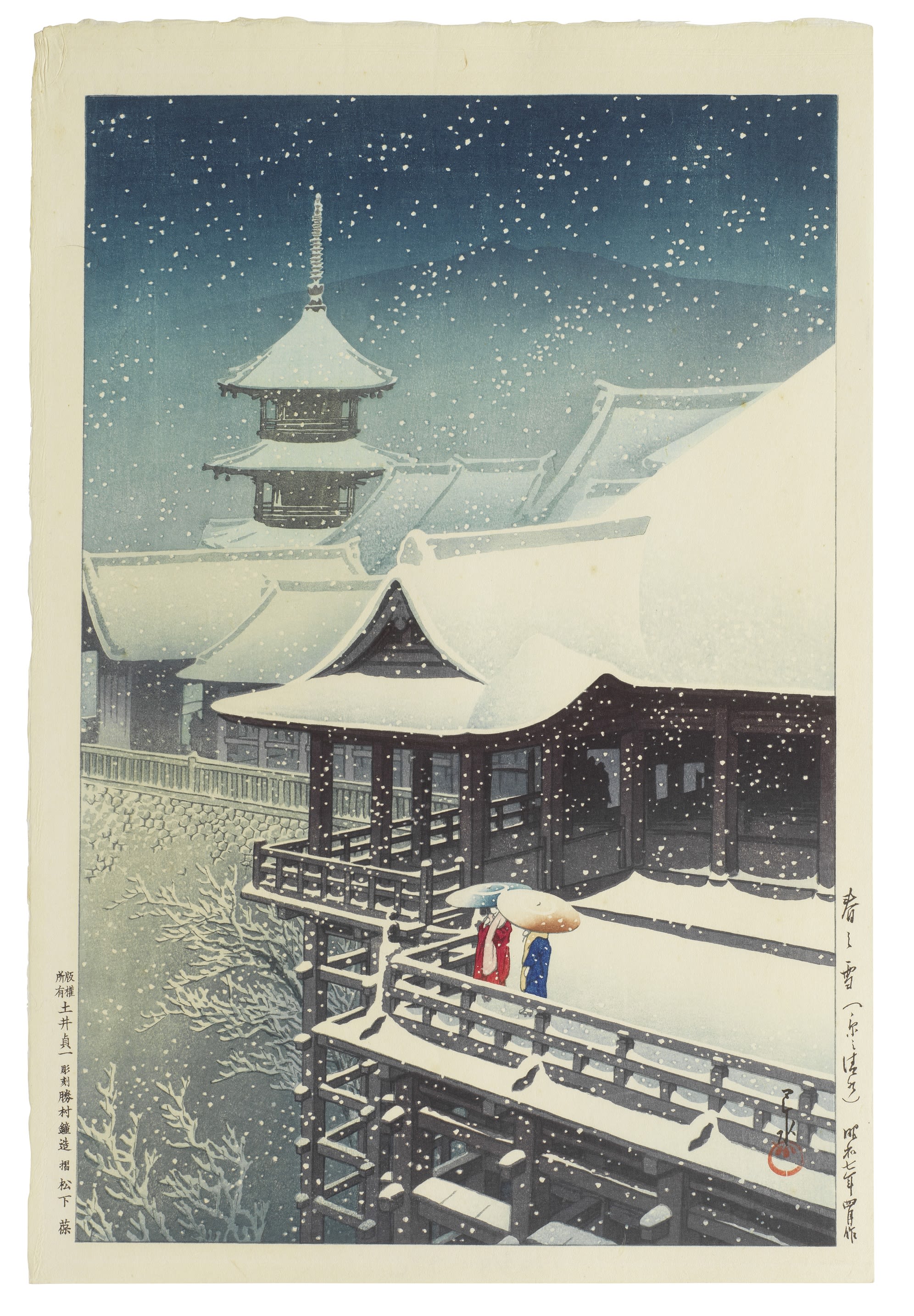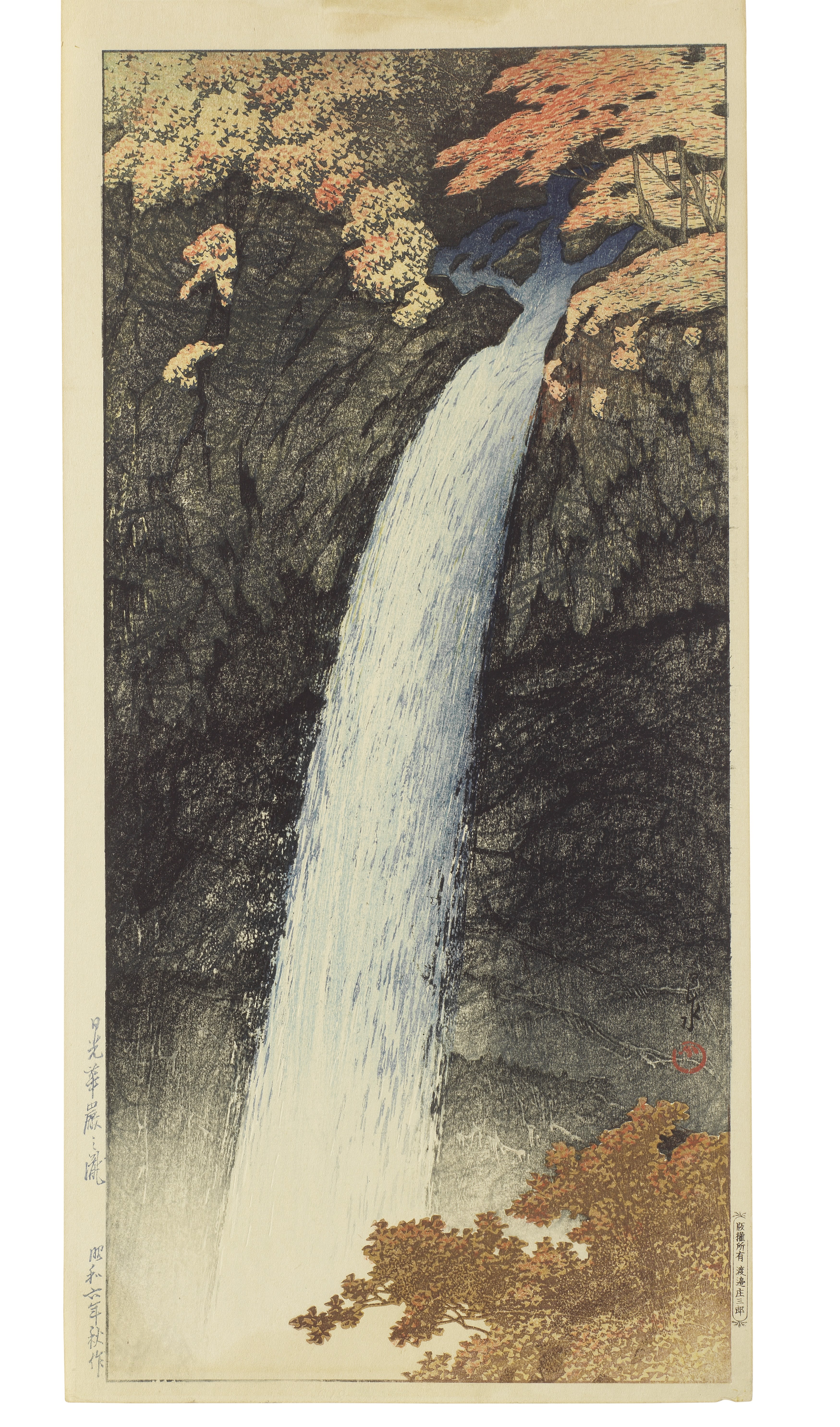 The prints offered in this auction offer a mere glimpse into the artist’s mastery of landscape, from rare pre-earthquake printings to post-WWII compositions. The majority originates from private collections with some bearing the earliest copyright seals of his long-term publisher, Watanabe Shozaburo. A few designs are even earlier and rarer, dating from before the great earthquake that devastated Tokyo and Yokohama in 1923, while there are also rare first editions—seldom offered at auction—produced jointly by the Tokyo publishers Sakai and Kawaguchi, exemplified by the elegant wintry highlights from the Twinight Collection, which all belong to an American private collector.