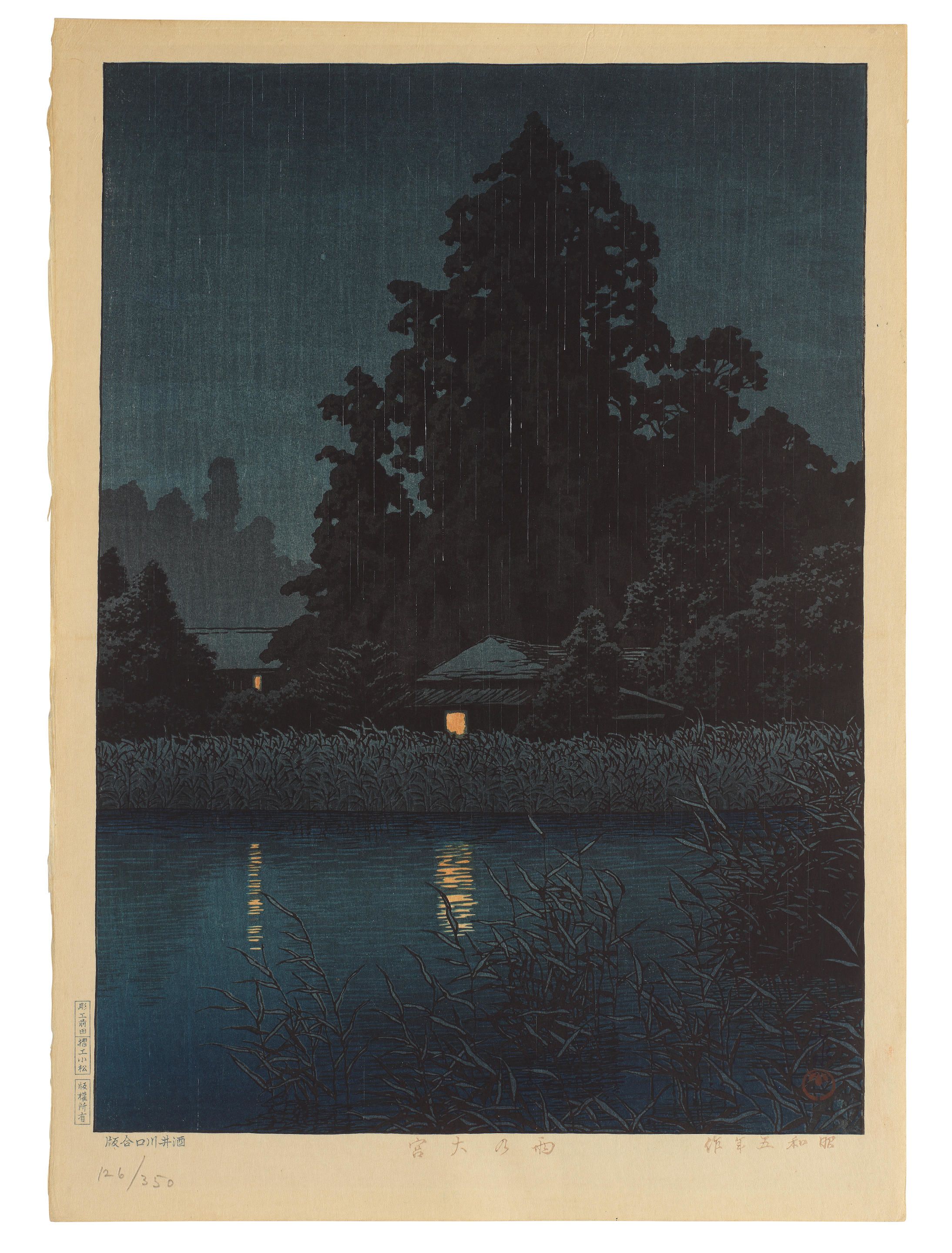 From poetic renditions of dusk and moonlight, snow blizzards to sudden rainfall, dappled sunlight to the embrace of shadows, Hasui delights in capturing the splendour of a season or the fleeting beauty of a moment. Characterized by a serenity of mood and flawless composition, his prints guide the viewer through Japan with an enduring intimacy and sensibility.