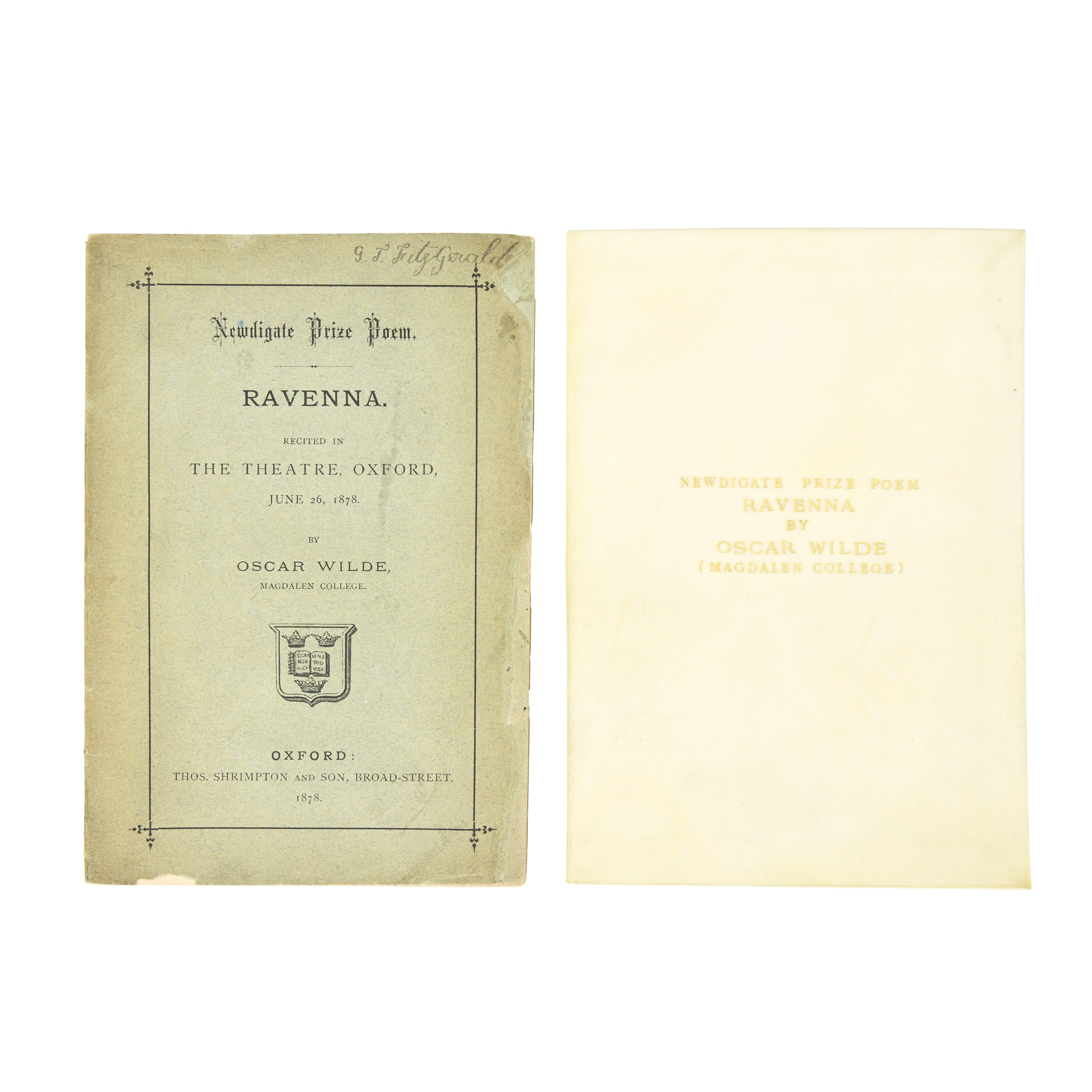 Wilde (Oscar), Newdigate Prize Poem, Ravenna, FIRST EDITION, Oxford, Thos. Shrimpton & Son, 1878. Estimate: £600 - £800.