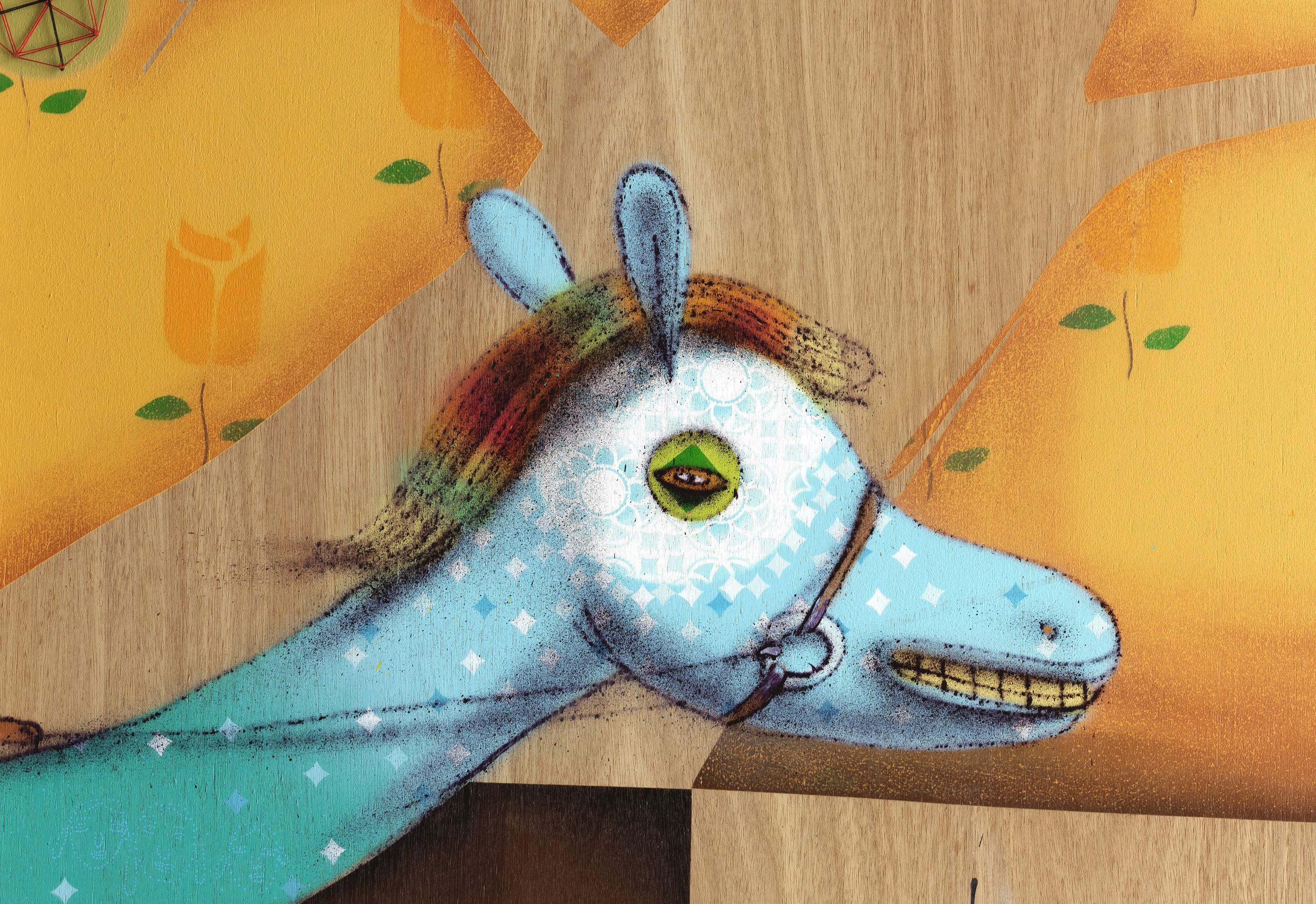 The larger than life long-limbed yellow figures of Osgemeos are simple yet incredibly playful. From paintings to sculpture, installation, digital animations and even a Boeing 737, their images often include graffiti taggers garbed in brightly patterned clothes. Keen to explore the surreal, the duo also use discarded doors, mirrors and walls to create works that signify an entry point to another world: a portal to alternative spaces where reality is irrelevant.