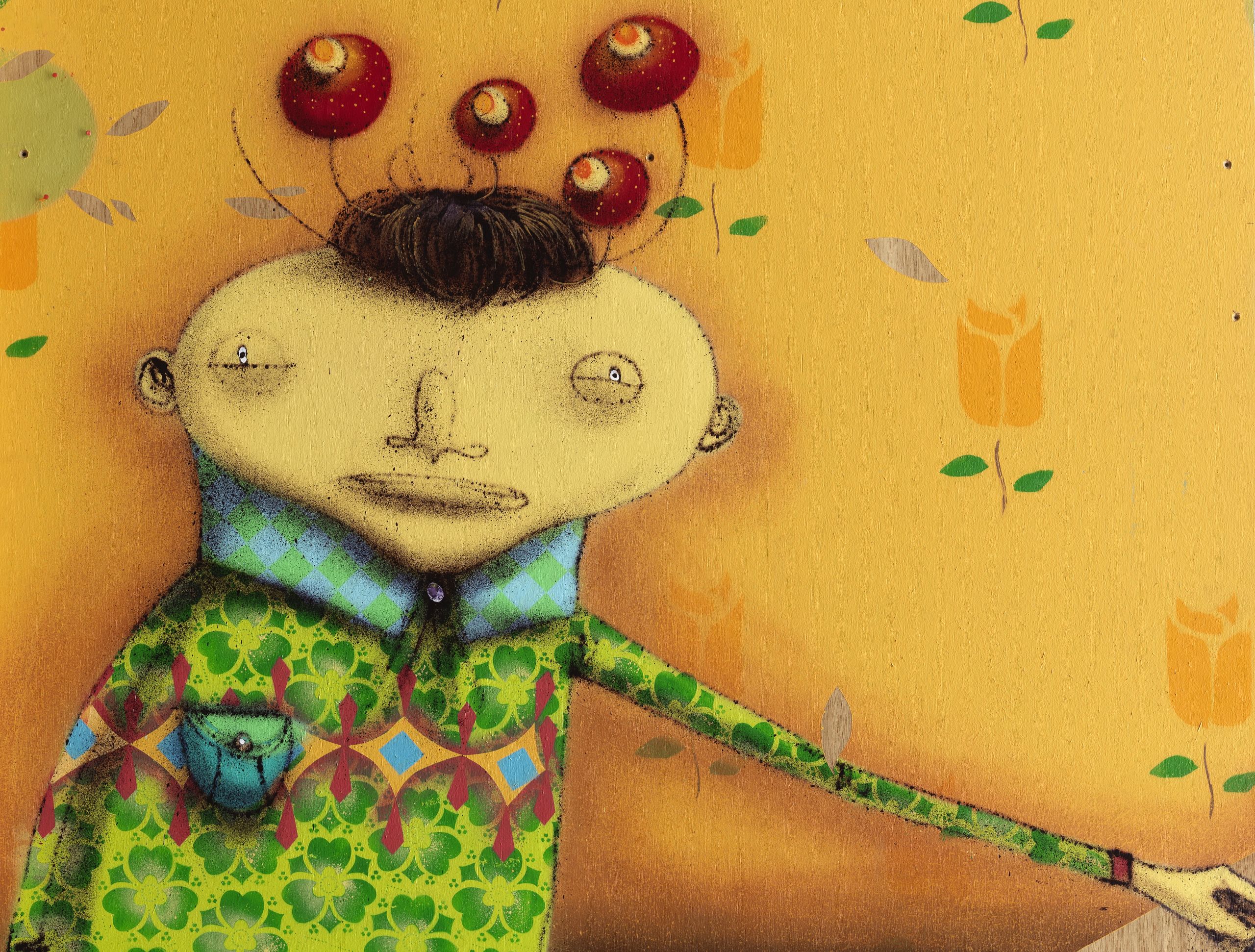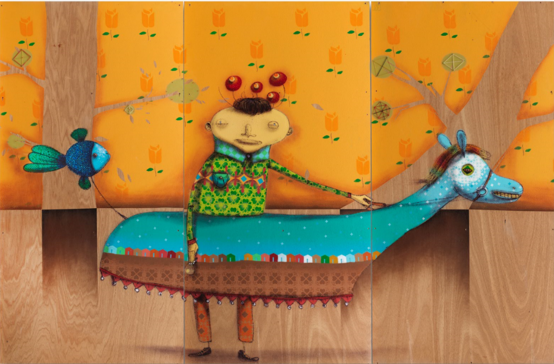Inspired by the yellow tinge both share in their dreams, their figures have become representative of the world’s diverse population. Using both urban and rural motifs of Brazilian culture; from street carnivals, music and folk art to hooded youths breaking into train yards, they create signature portraits. While their aesthetic is fully representative of their unique style, the fantastical elements of their work have been compared to the paintings of Hieronymus Bosch and M. C. Escher.