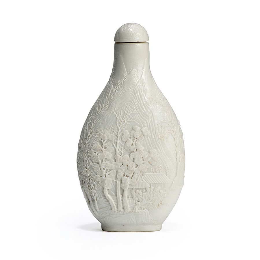 Lot 88. An Important Carved Landscape Porcelain Snuff Bottle. Chen Guozhi, attributed to Jingdezhen, 1820-1860. Sold for US$25,500 inc. premium