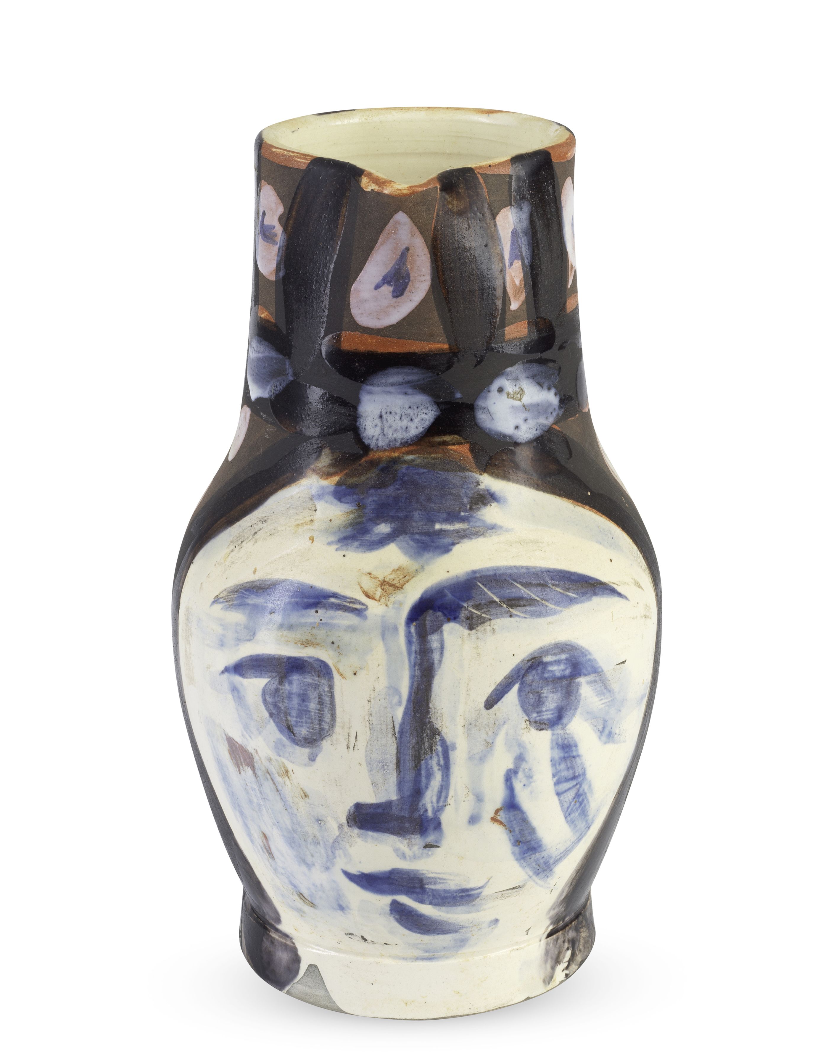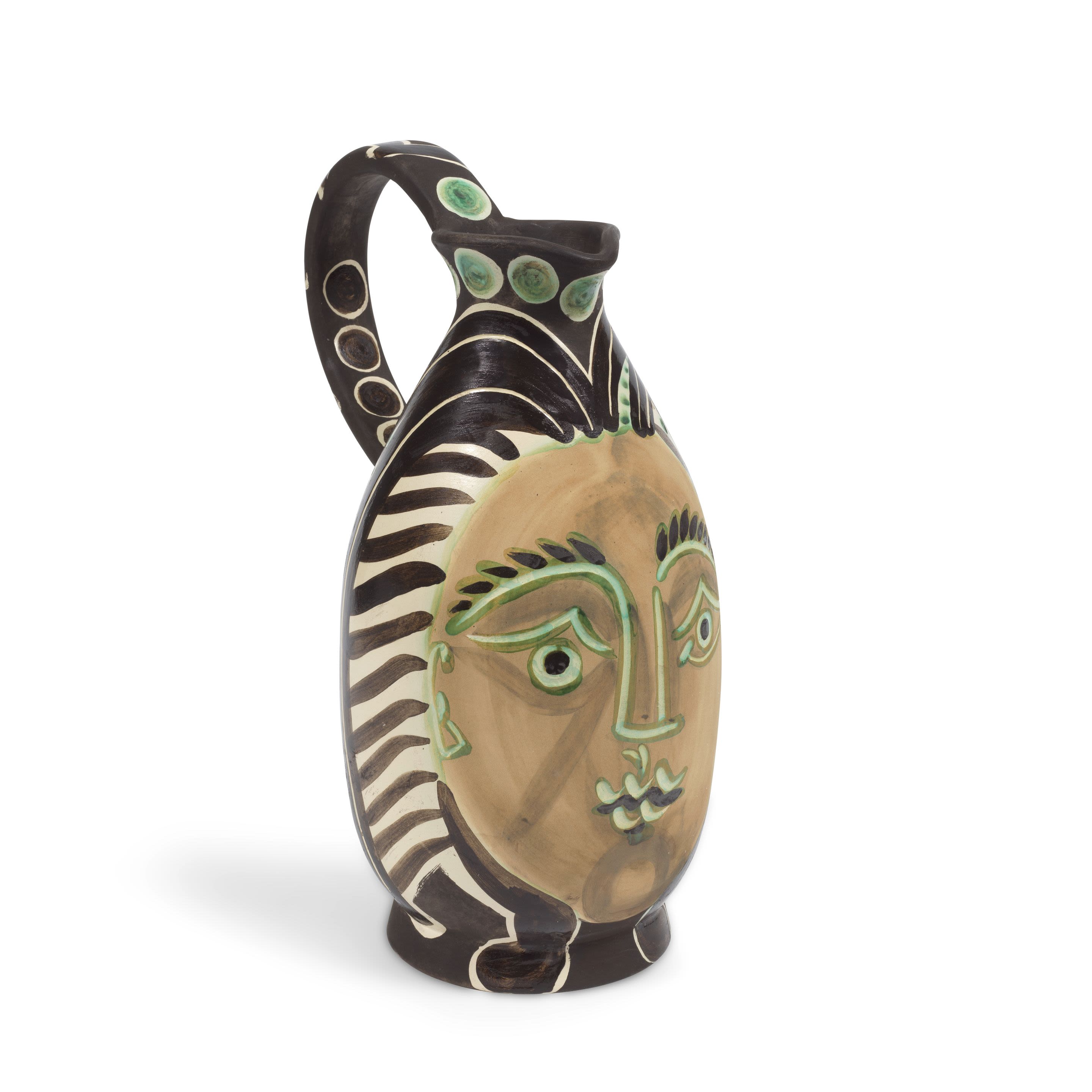 Another standout is Pablo Picasso’s ceramic Femme du barbu, in which a stylized female face emerges from the front of a pitcher, framed by sweeping lines that accentuate the vessel’s rounded form. Drawing on ancient Mediterranean ceramic traditions, Picasso blended classical influences with his bold modern sensibility, creating works that feel at once timeless and distinctly his own. The sale also includes an impressive group of additional ceramics by the prolific artist, including Tête peinte, Motifs no. 7, Tête de chèvre de profil among other notable works.