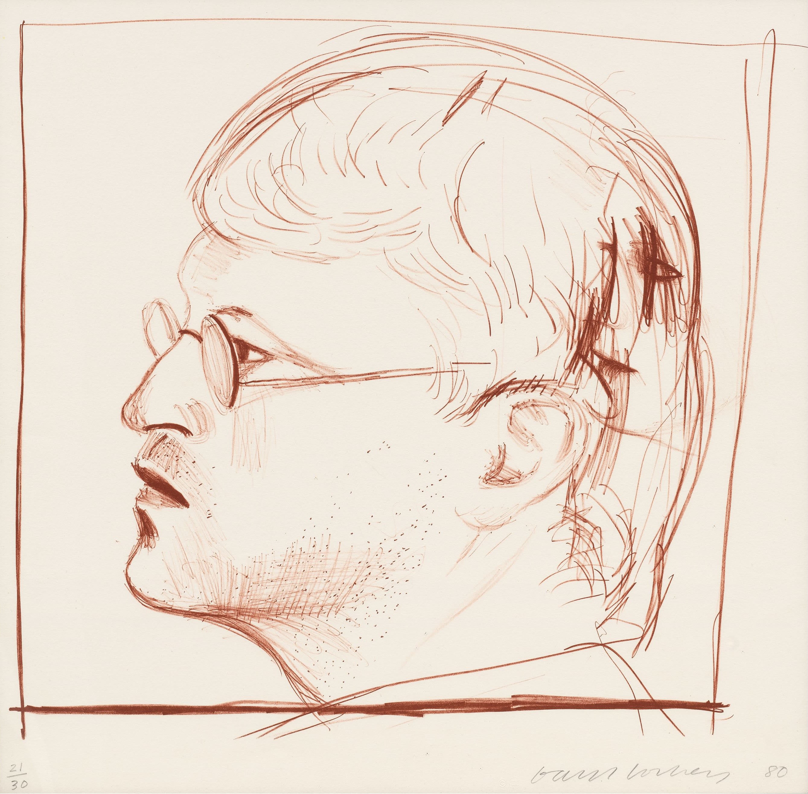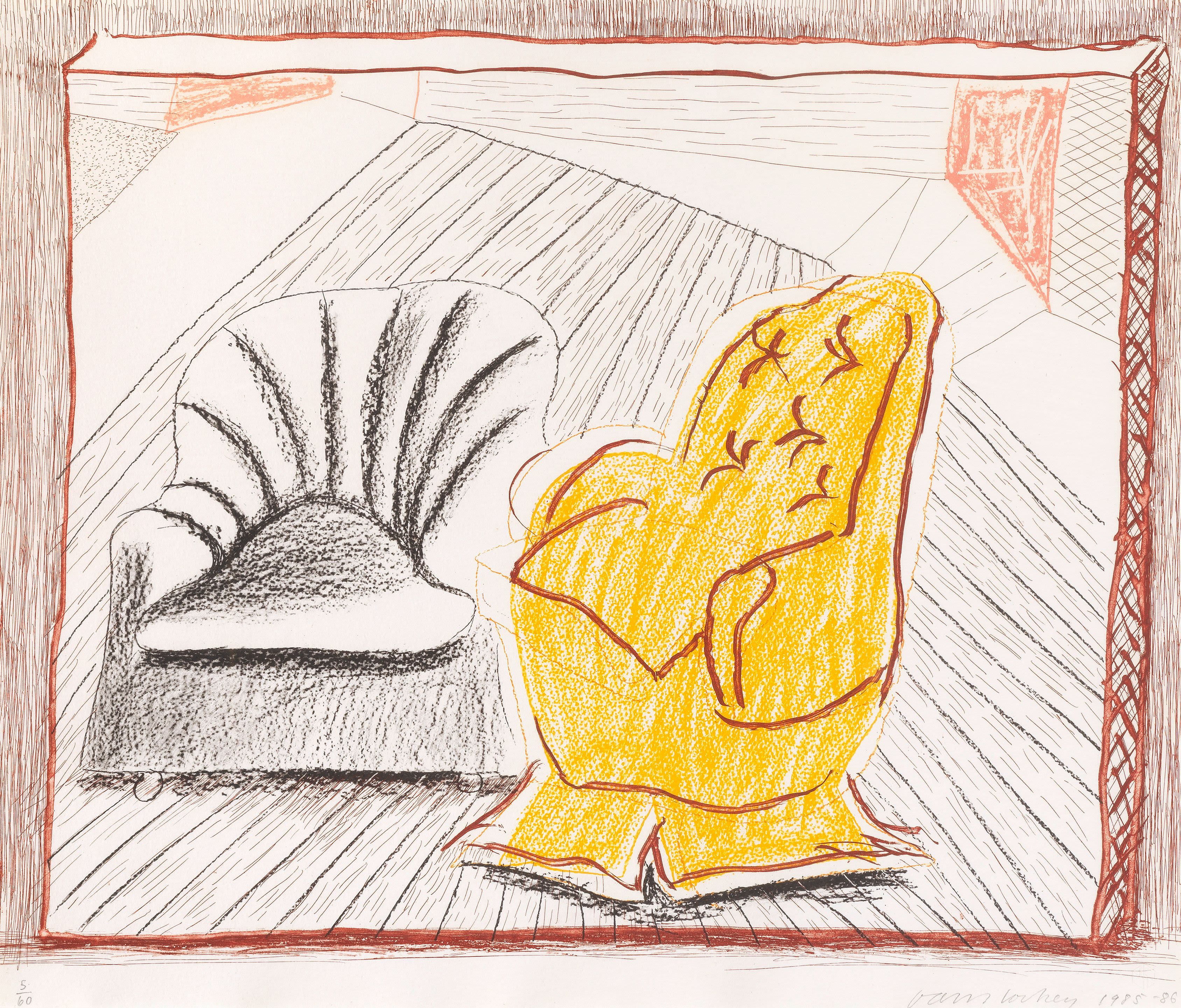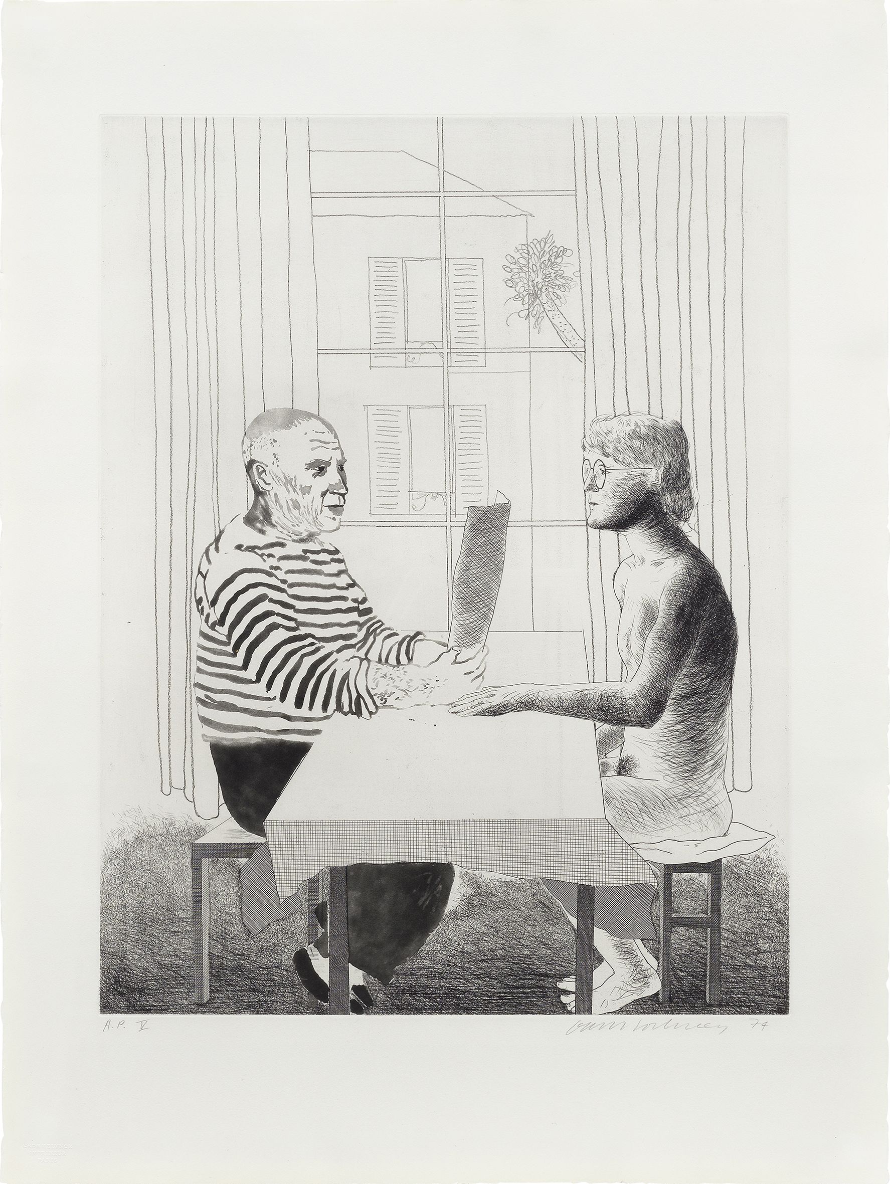 Hockney’s admiration for Picasso began during his years at the Royal College of Art and has remained a guiding force throughout his career. In this print, Picasso sits in his iconic striped shirt examining a sheet of paper, while a nude Hockney sits opposite him, observant, vulnerable, and reverent. The work captures Hockney’s ongoing dialogue with the legacy of the modern master who profoundly shaped his artistic outlook.