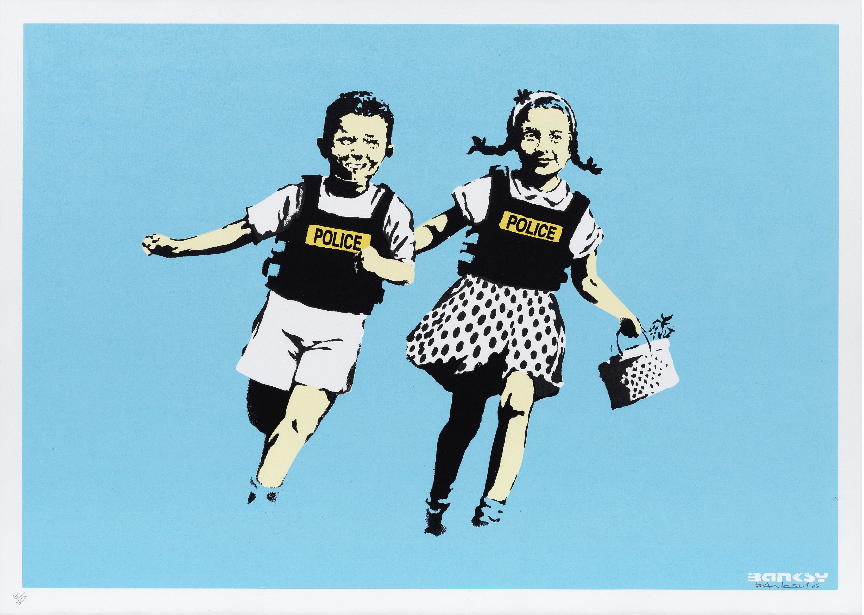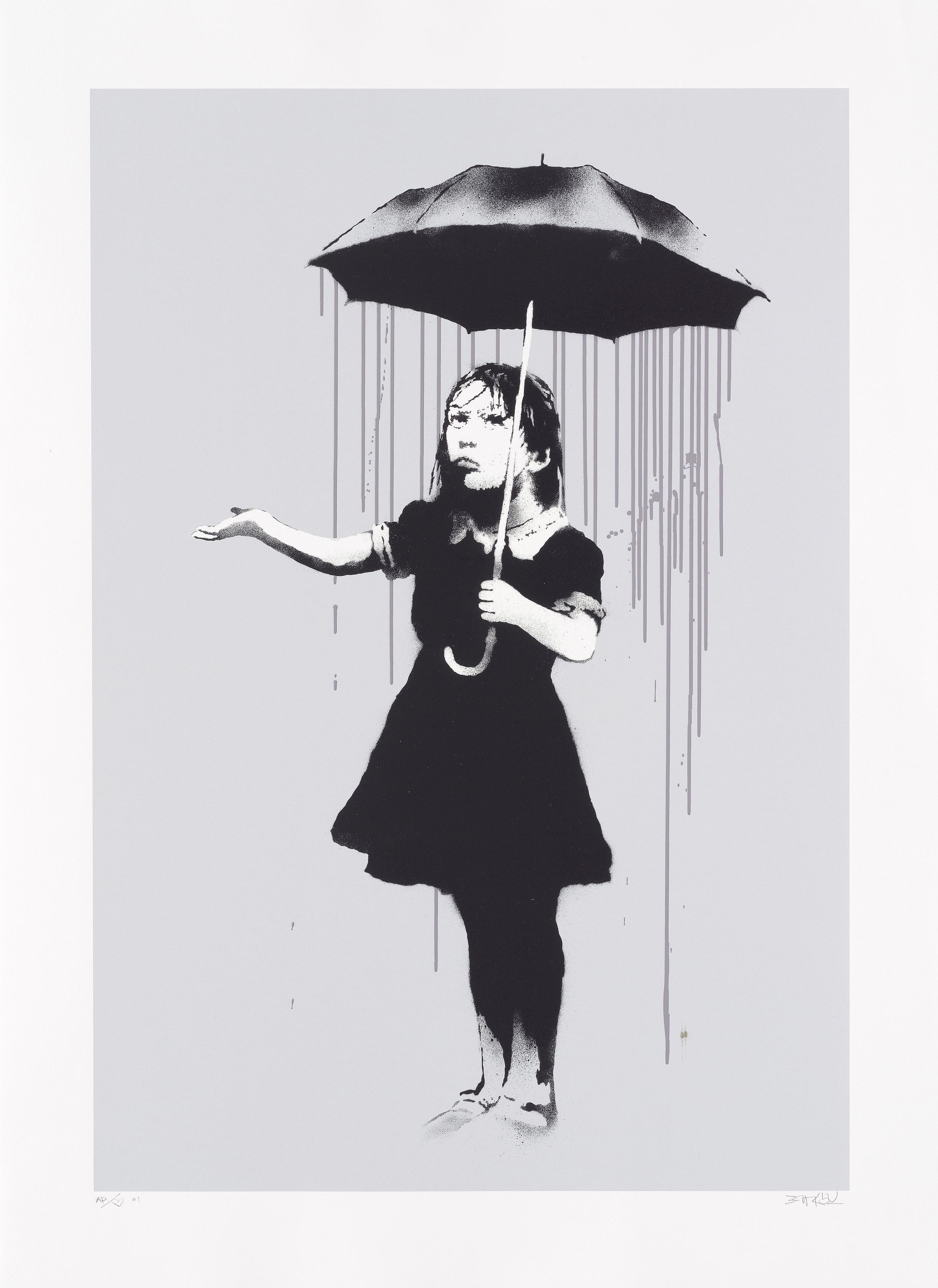 The auction also includes several iconic signed impressions by Banksy, among them Christ with Shopping Bags, Jack & Jill, and NOLA (A/P), the latter, a striking image first unveiled on the streets of New Orleans in 2008. The image of a young girl being drenched by rain that falls from the interior of her own umbrella operates as a powerful metaphor for the tragic aftermath of Hurricane Katrina in 2005. Here, the umbrella, ordinarily a symbol of shelter counters its function.