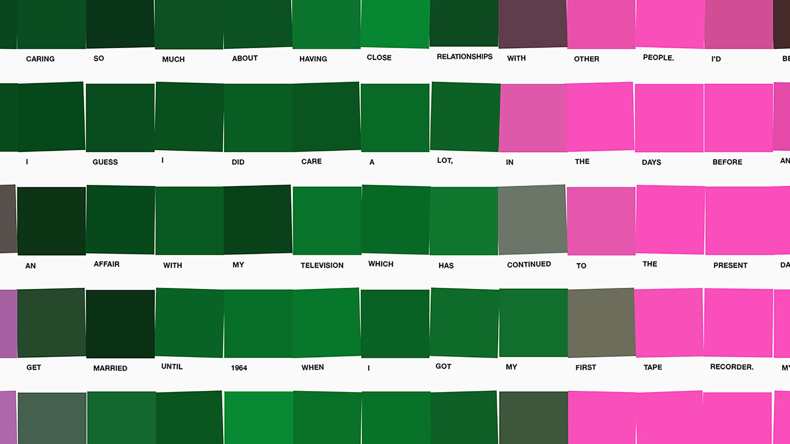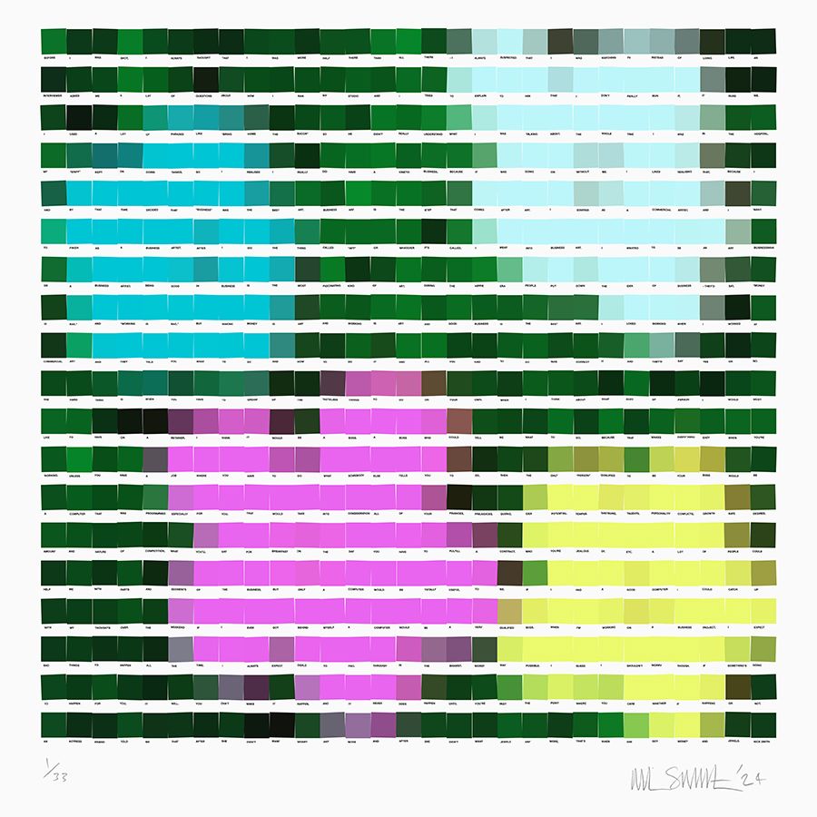 I explore the relationships between colour and word through pixelated collages. Up close, my work is abstract in nature. Yet from a distance, it transforms into a distinct, coherent image. Beneath each colour chip lies a single word, introducing additional depth, playing with word colour association, or linking formative texts to the image.