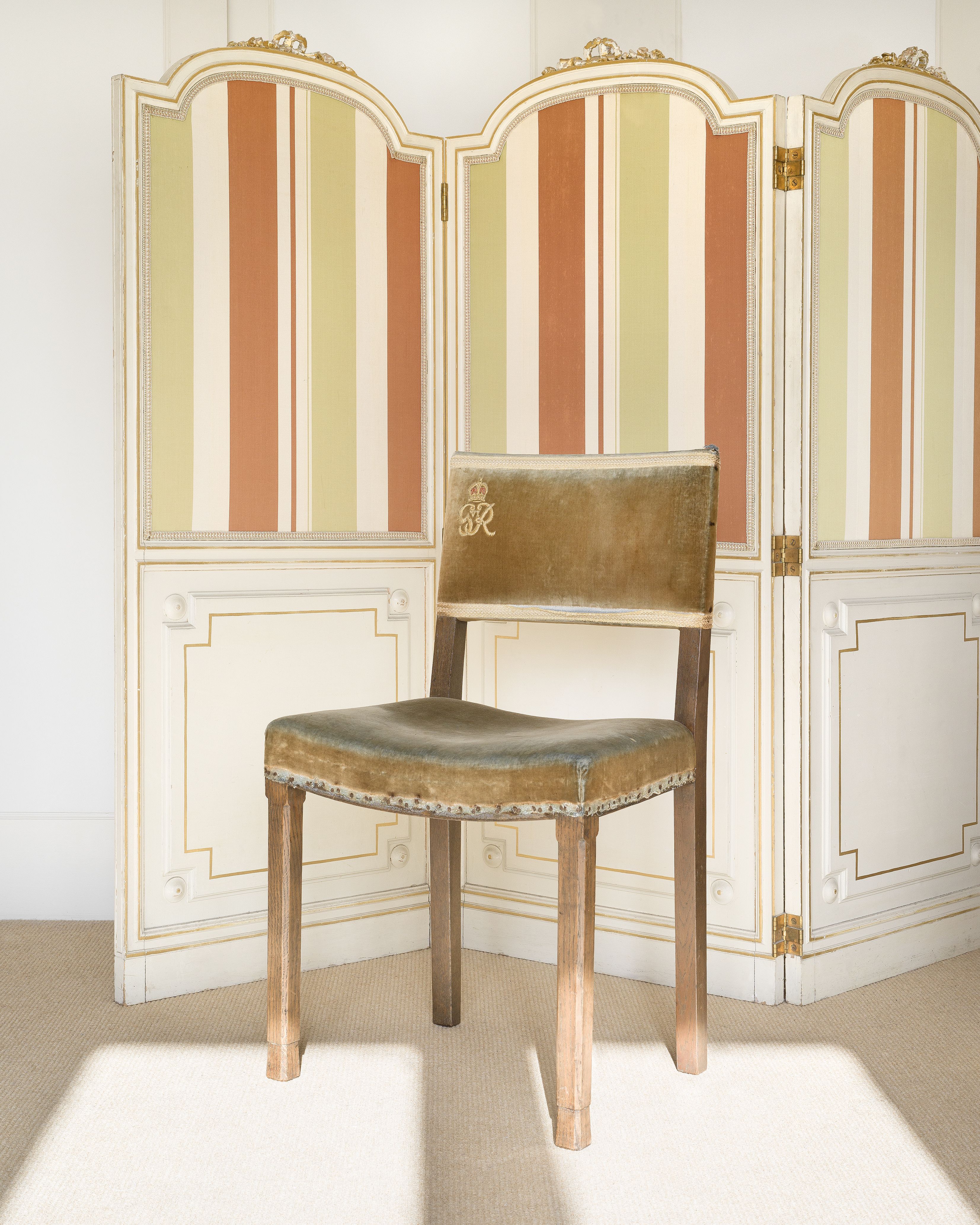 I am letting a few Coronation chairs go, too. At most Coronations, these are specially commissioned for the guests at Westminster Abbey, so all Coronation chairs have played their part in proceedings, bearing the monarch’s cypher. Again, distinguished guests could buy them afterwards, so you see them in many stately homes across Britain. Mine come from George VI’s Coronation in 1937 and the Queen’s in 1953 – chairs and also stools. Altogether I have 15, which I use as dining room chairs, since they were designed for people to sit in comfort for hours in extremely uncomfortable clothes. Some rather nice copies were made as replicas for the Silver Jubilee in 1977 (I have five of the smart copies at home, and there is one in the royal pew at the chapel at Royal Lodge).