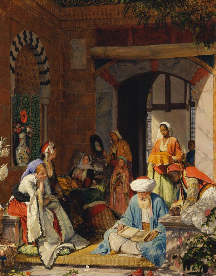 There are two versions of this work by the celebrated English orientalist painter John Frederick Lewis. The oil painting in the Yale Centre for British Art is tinged with the golden glow we’d expect of a Victorian view of the East.