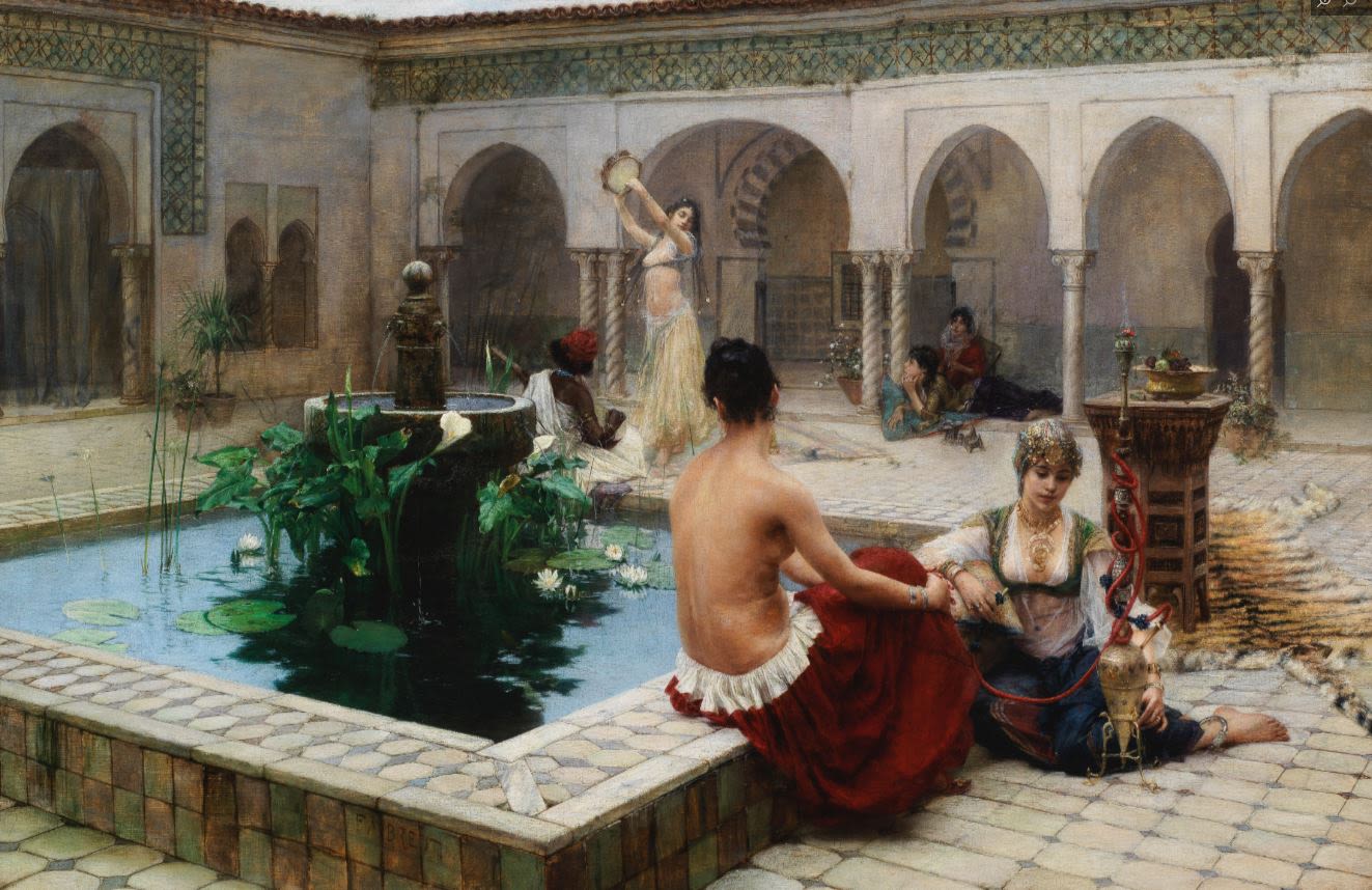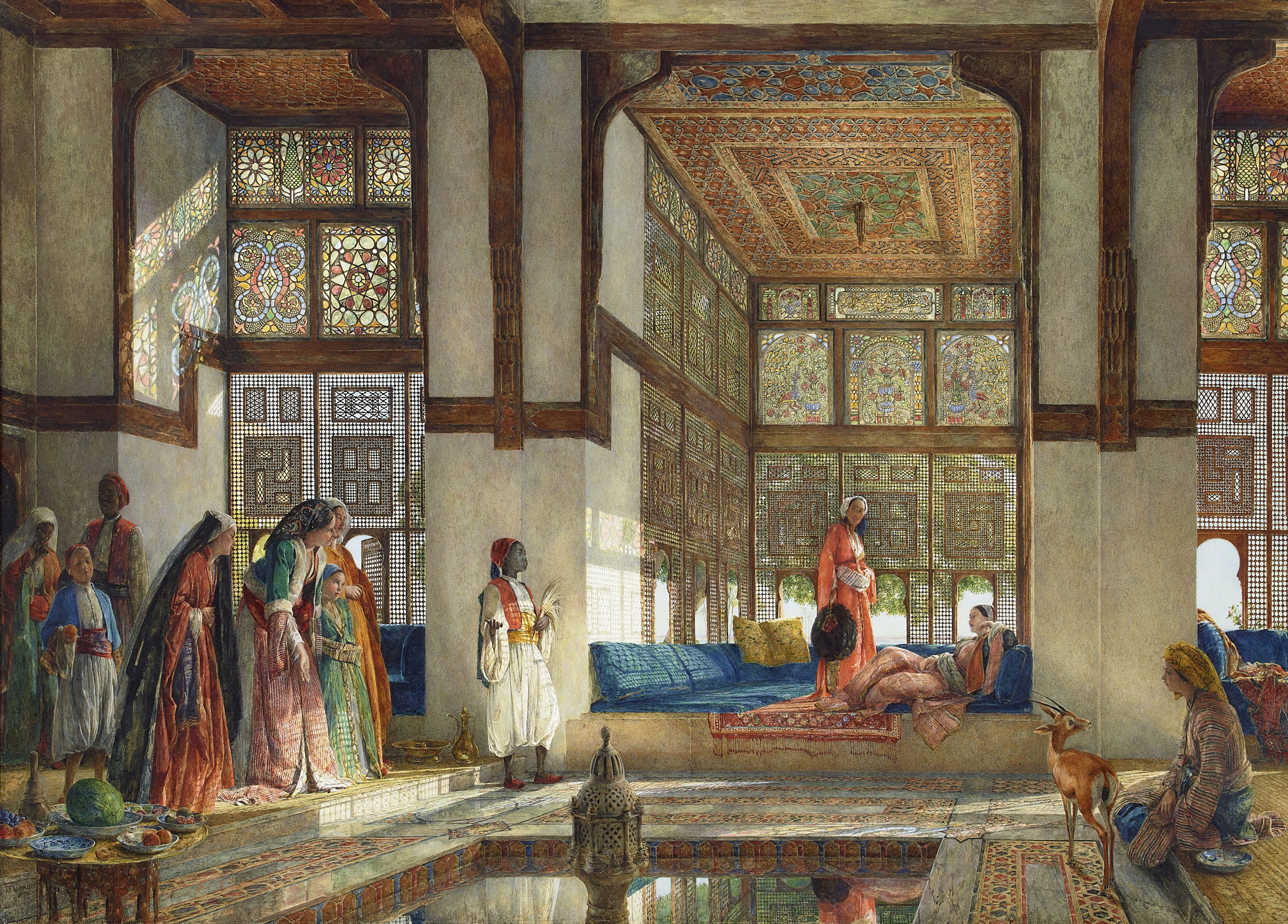 The shadows of lattice screens bathe walls, marble floors and the bodies of sumptuously attired figures. These are surfaces designed to allow observation of the street outside, while keeping the interior of the house, specifically its female inhabitants, free from prying eyes behind an inscrutable facade.