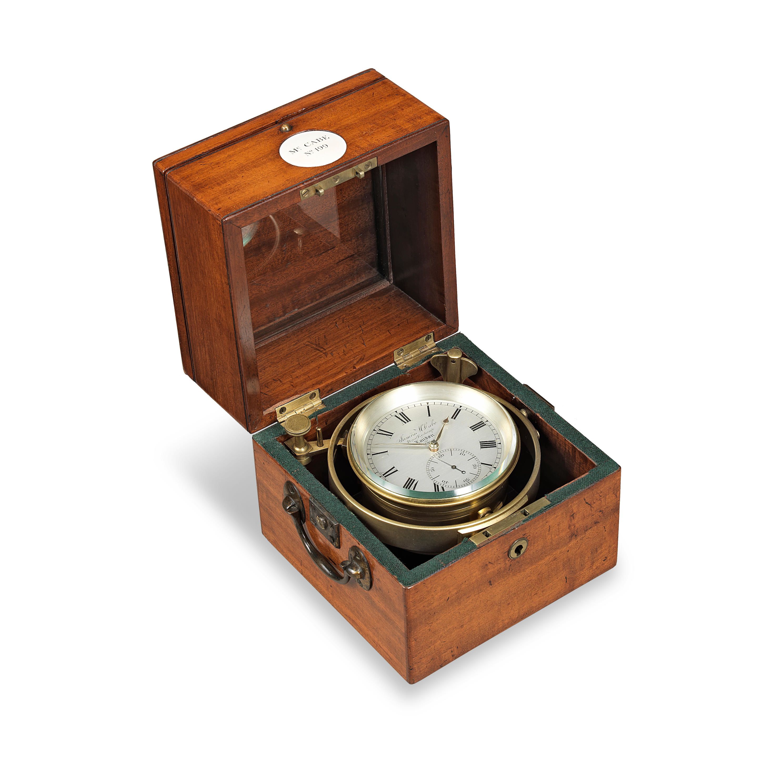 A marine chronometer is a specialised clock, designed to be used onboard a ship to determine its position. The invention of the marine chronometer in the 18th century was a major technical accomplishment: for the first time, a ship’s longitude could be accurately measured, and navigational disasters averted. It proved an invaluable nautical tool and was adopted by seafarers around the globe. Marine chronometers are traditionally large items, with the precision timepiece set into a wooden case to protect it from knocks and damp during voyages.