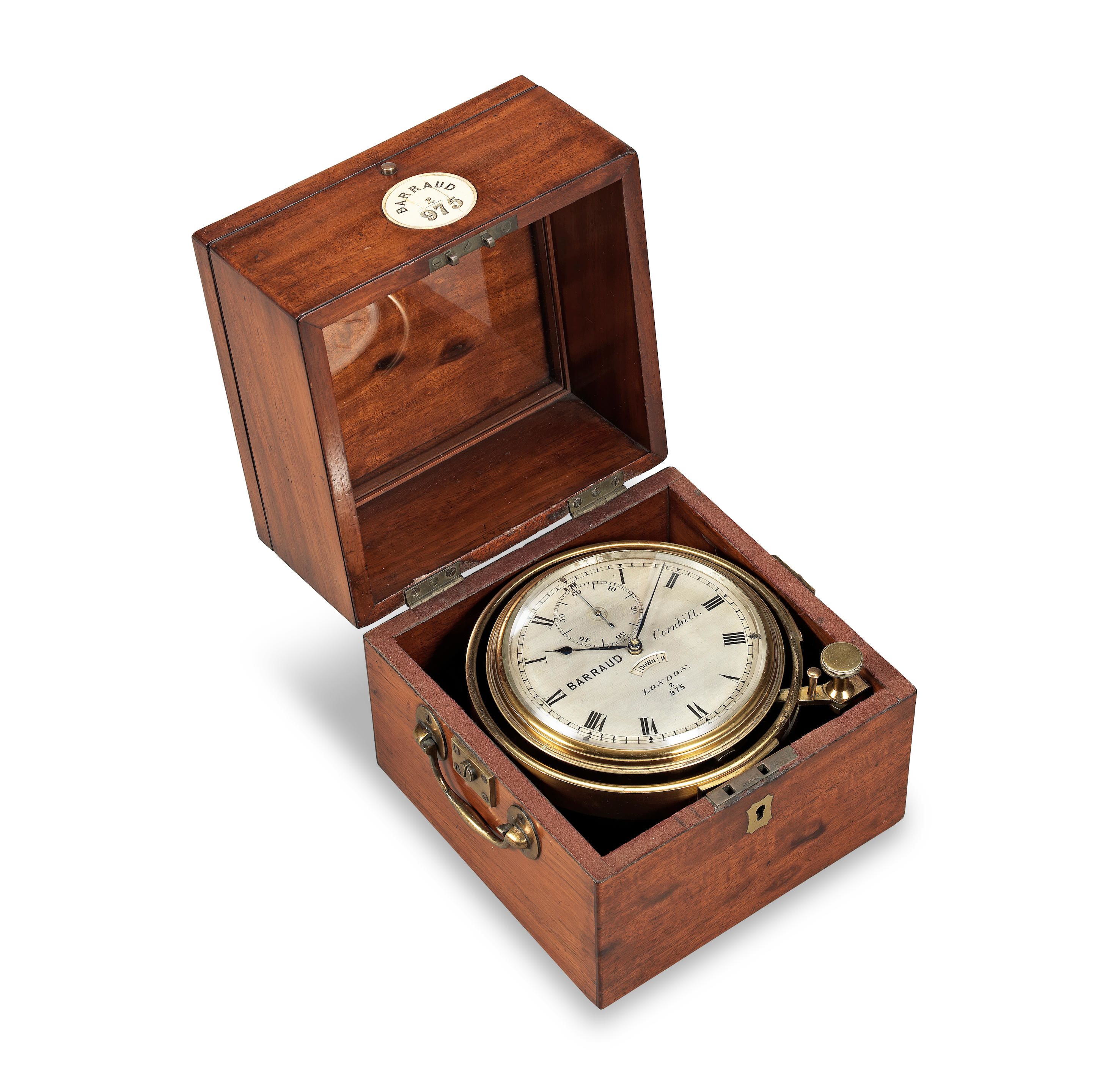 Lot 57. A good and rare 19th century 8-day mahogany marine chronometer with power reserve aperture and integral winding key. Barraud, Cornhill, London. Numbered 2/975. Sold for £4,080 inc. premium