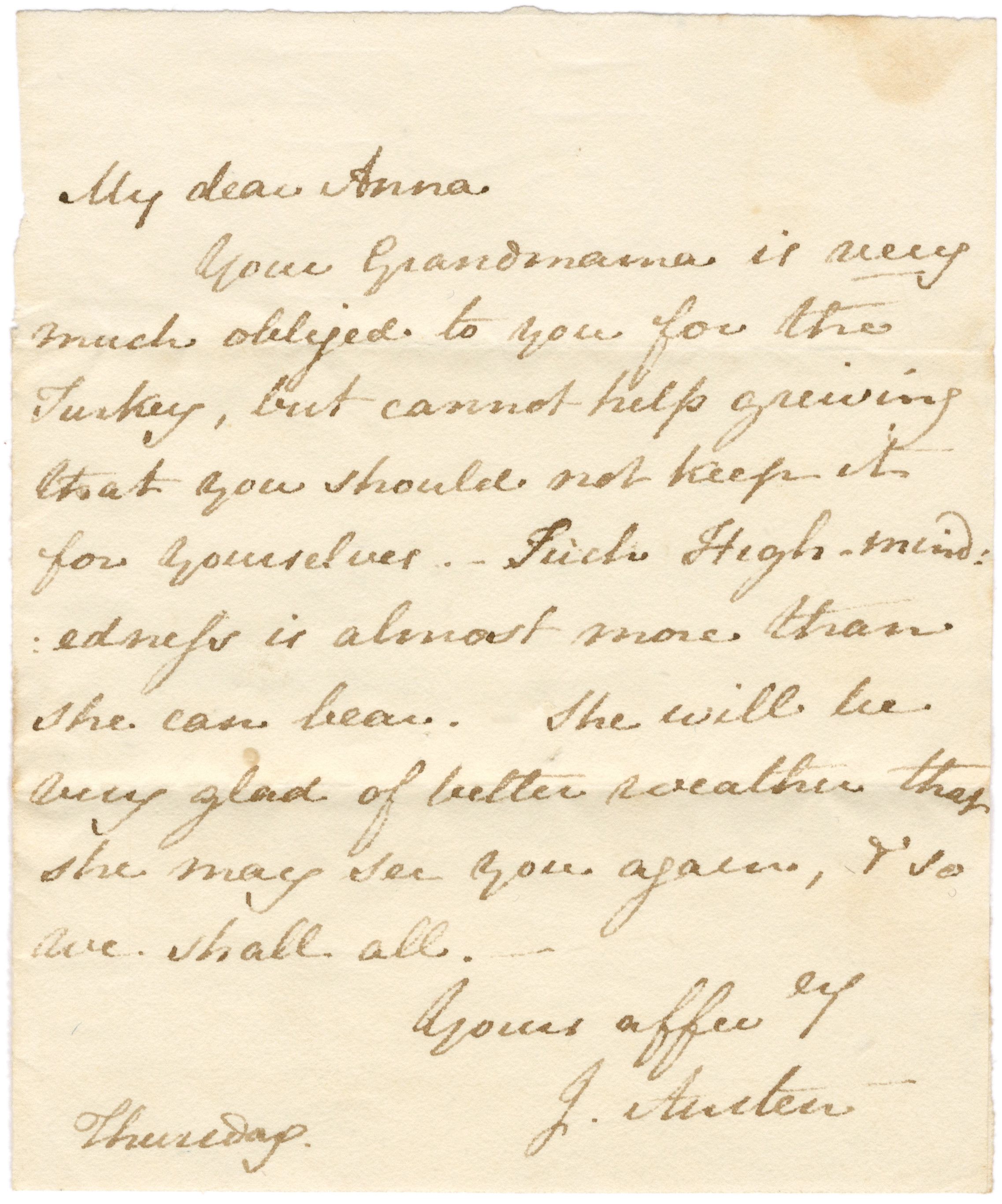 Sourced in Leeds: Jane Austen, Autograph letter signed ("Yours affec.ey/ J. Austen") to "My Dear Anna [Lefroy]", [Chawton], Thursday [December? 1816]. Sold for £75,250 inc. premium