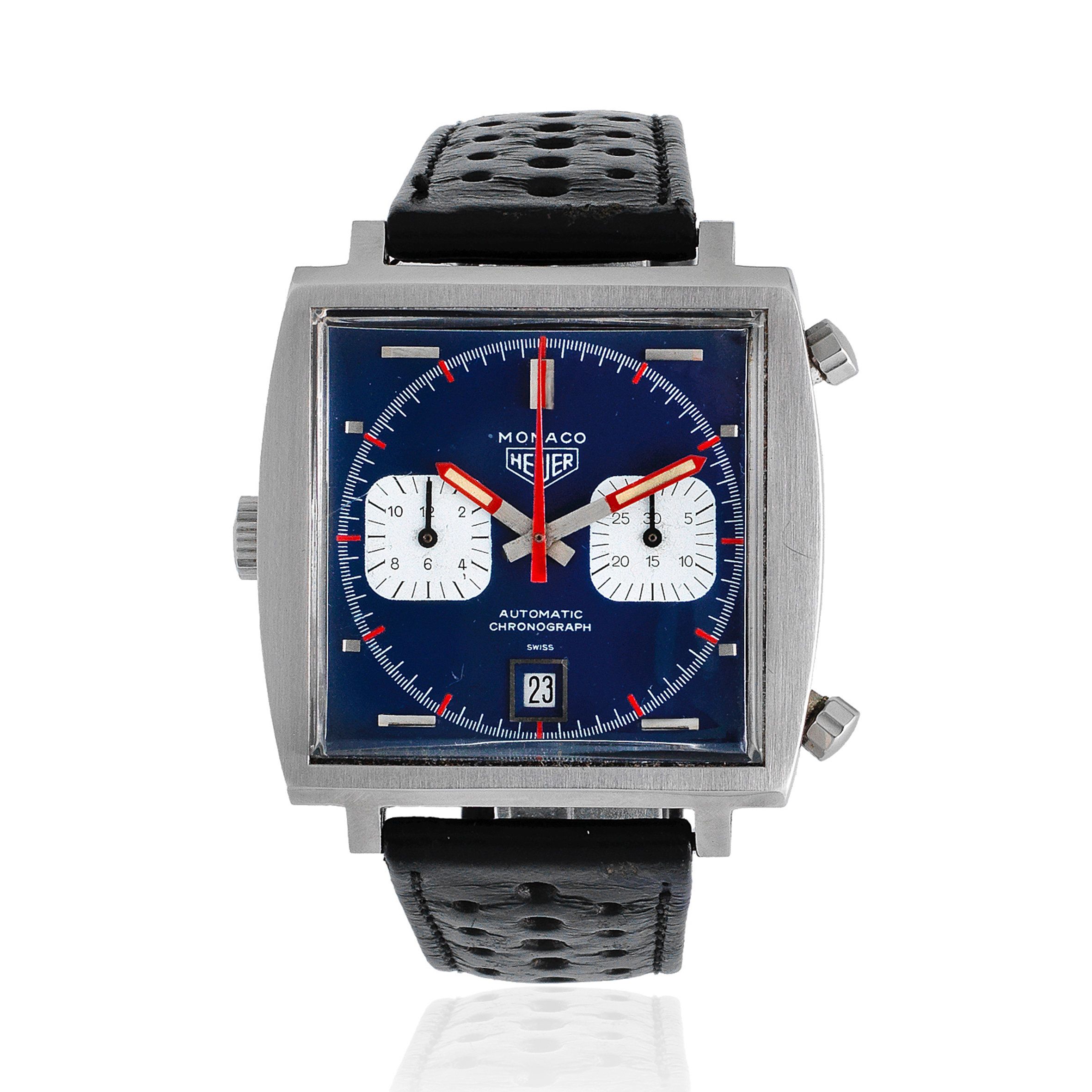 Lot 36. Heuer. A Fine Stainless Steel Automatic Calendar Chronograph Square Wristwatch, Monaco, Ref: 1133, Circa 1970, £ 8,000 - 12,000.