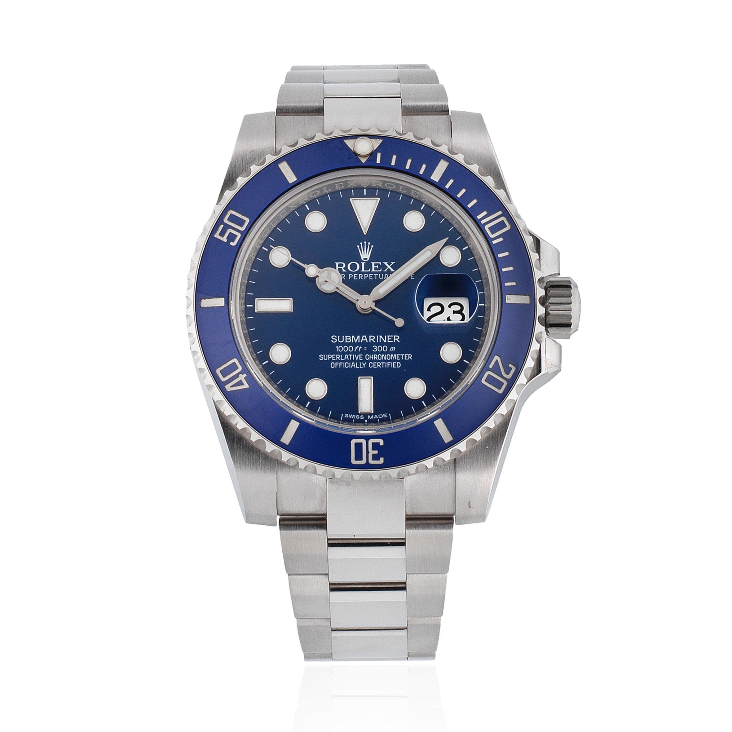 Lot 103. Rolex. A Fine 18K White Gold Automatic Calendar Bracelet Watch, Submariner 'Smurf', Ref: 116619 LB, £ 15,000 - 20,000.