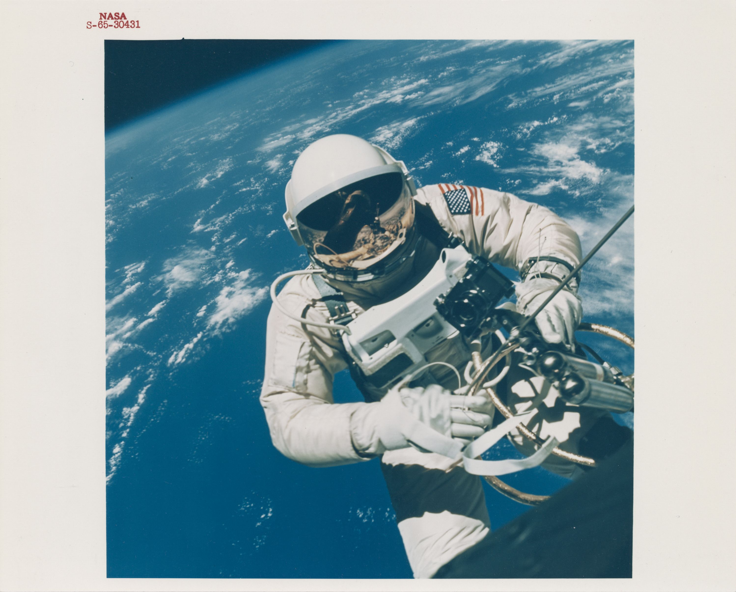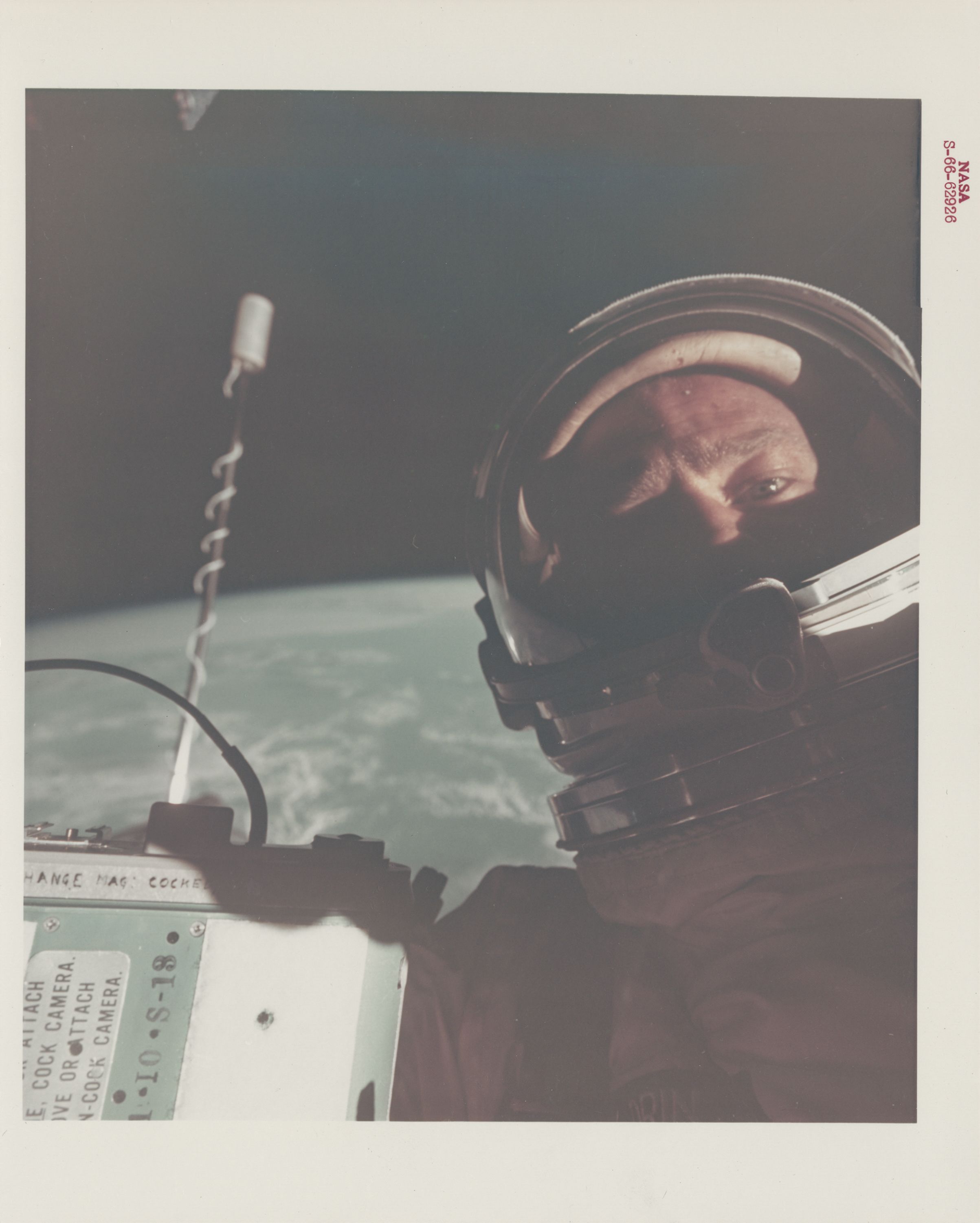 Captured by James McDivitt during Gemini 4, this shows an exhilarated Ed White upon his return to the Gemini capsule after America’s first spacewalk.