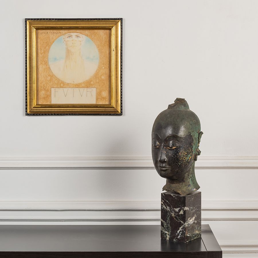 Top: Fernand Khnopff (1858-1921), Fore Aeternum, Futur, 1909. Estimate: €100,000 - 150,000; Bottom: Tête De Bouddha En Alliage De Cuivre, Thaïlande, Style Sukhothai Tardif, Vers Le XVIE Siècle. Estimate: €10,000 - €15,000