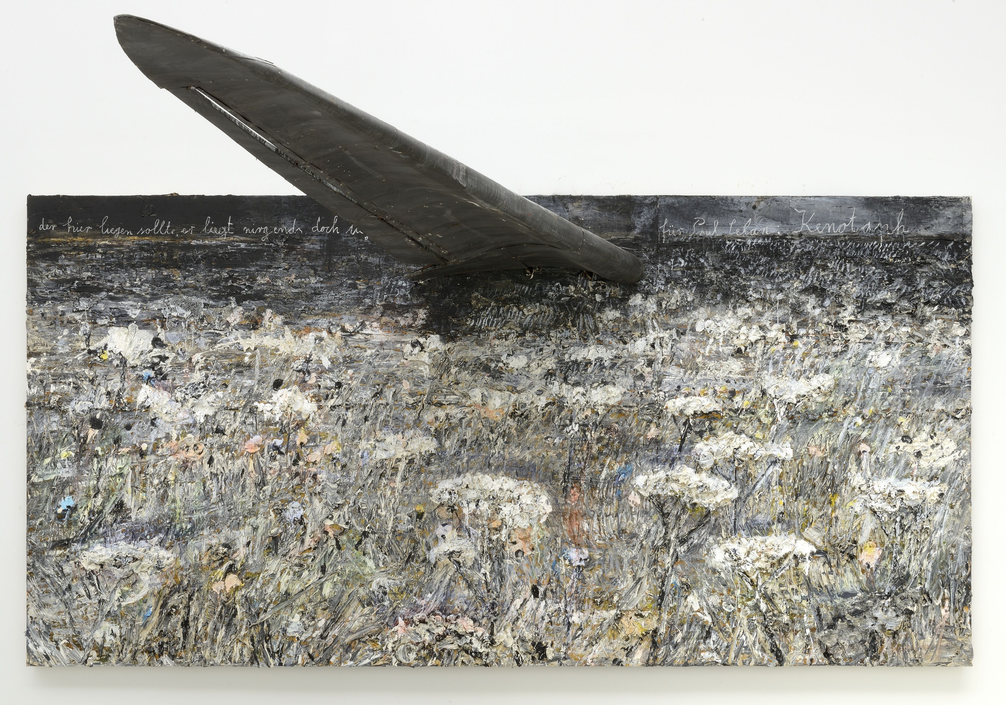 Nonetheless, the name of the work is instructive, as is the small inscription that Kiefer has added in chalk above the wing. The title pays homage to Celan’s 1954 poem ‘Kenotaph’, a pair of lines from which provide the inscription: Der hier liegen sollte, er liegt/nirgends. Doch liegt die Welt neben ihm (‘He who was supposed to lie here lies/nowhere. Yet the world lies beside him’).