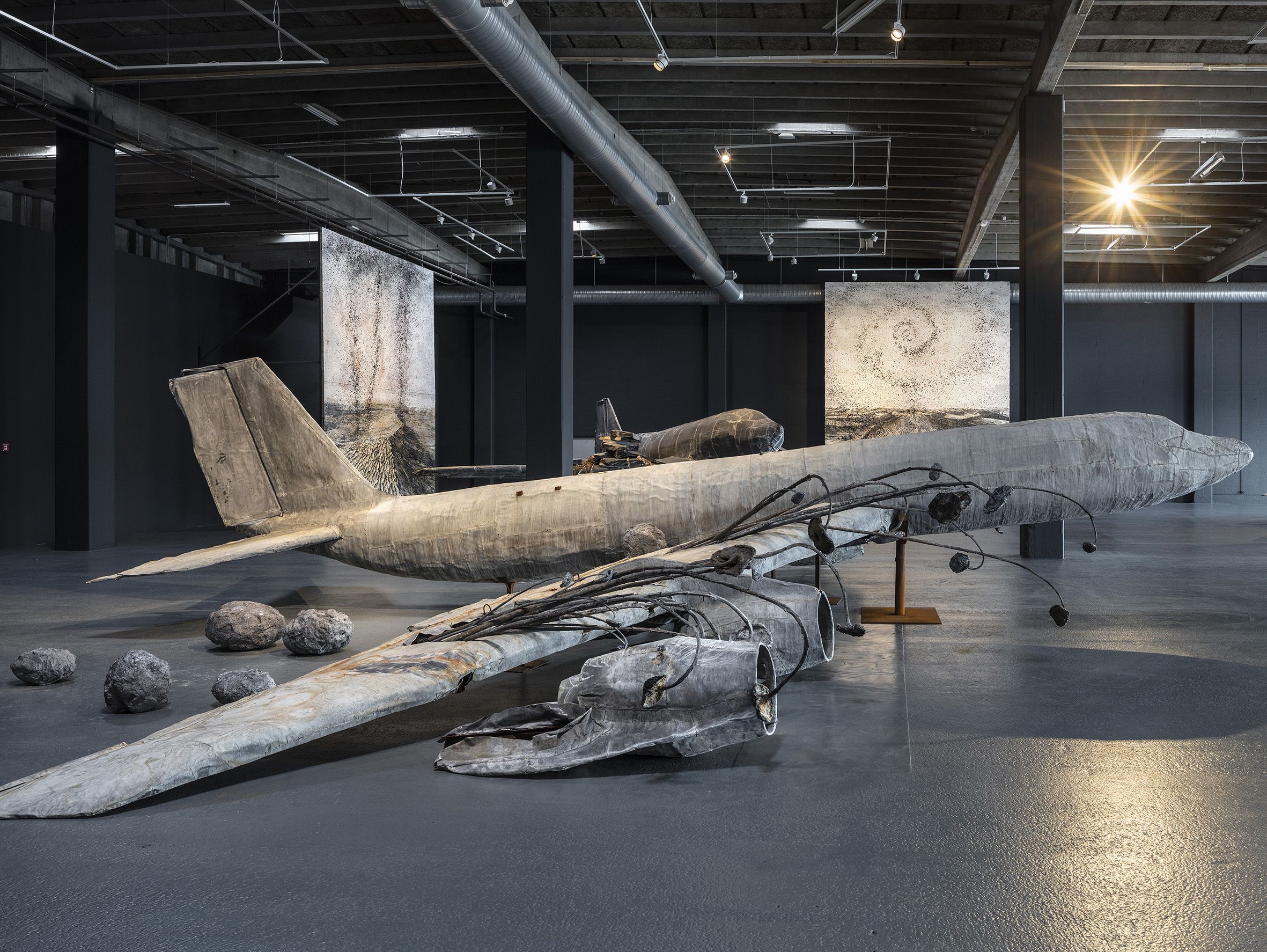 The landscape manages to look ancient and modern at the same time. The broadly black-white-and-grey palette gives a sense of the old, yet the stunning sight of an aeroplane wing jutting out of the canvas suggests a scene from the past century.